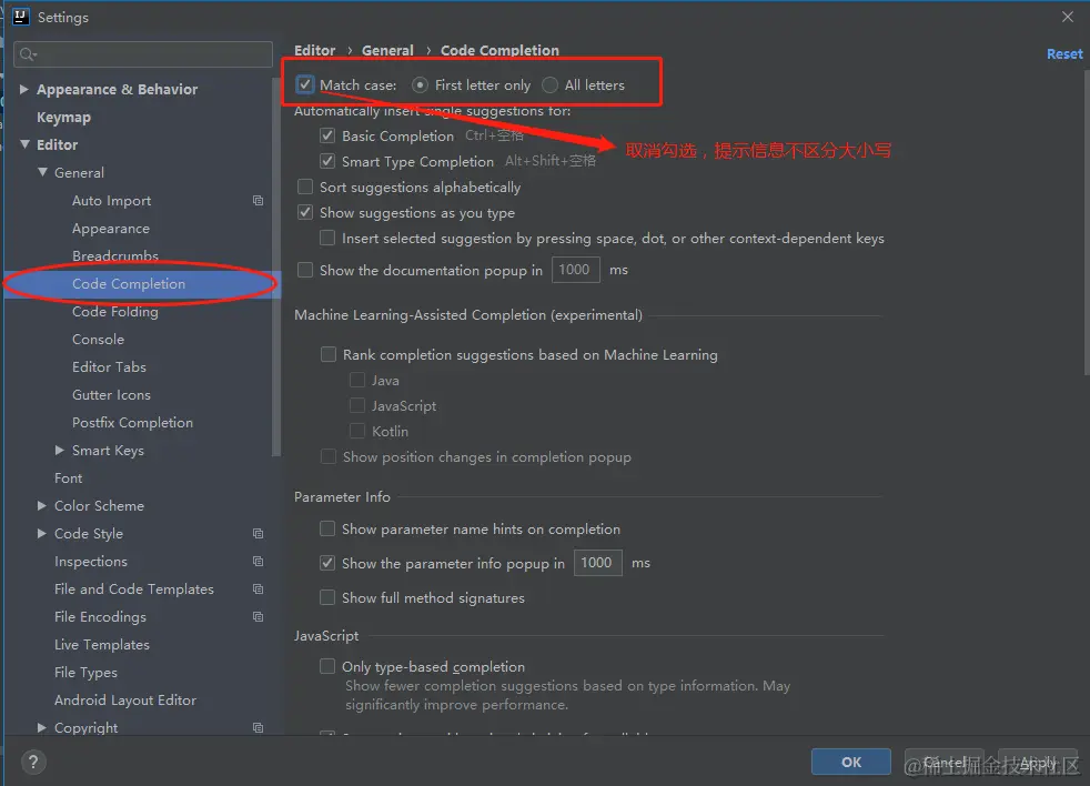 •具体操作:Settings --> Editor --> General --> Code Completion --> 取消勾选Match case