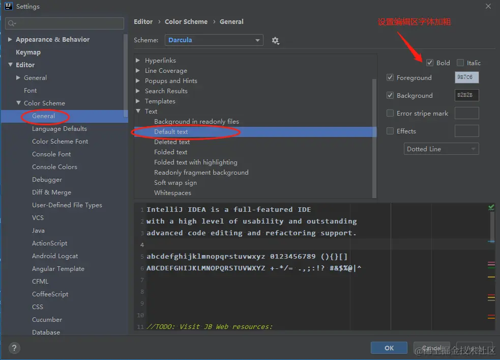 •具体操作:Settings --> Editor --> Color Scheme -->General --> Text --> Default text --> 勾选Bold