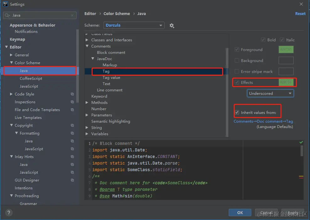 •具体操作:Settings --> Editor --> Color Scheme --> Java --> Comments --> Java doc --> Tag --> 先取消勾选Inherit values from,再取消勾选Effects