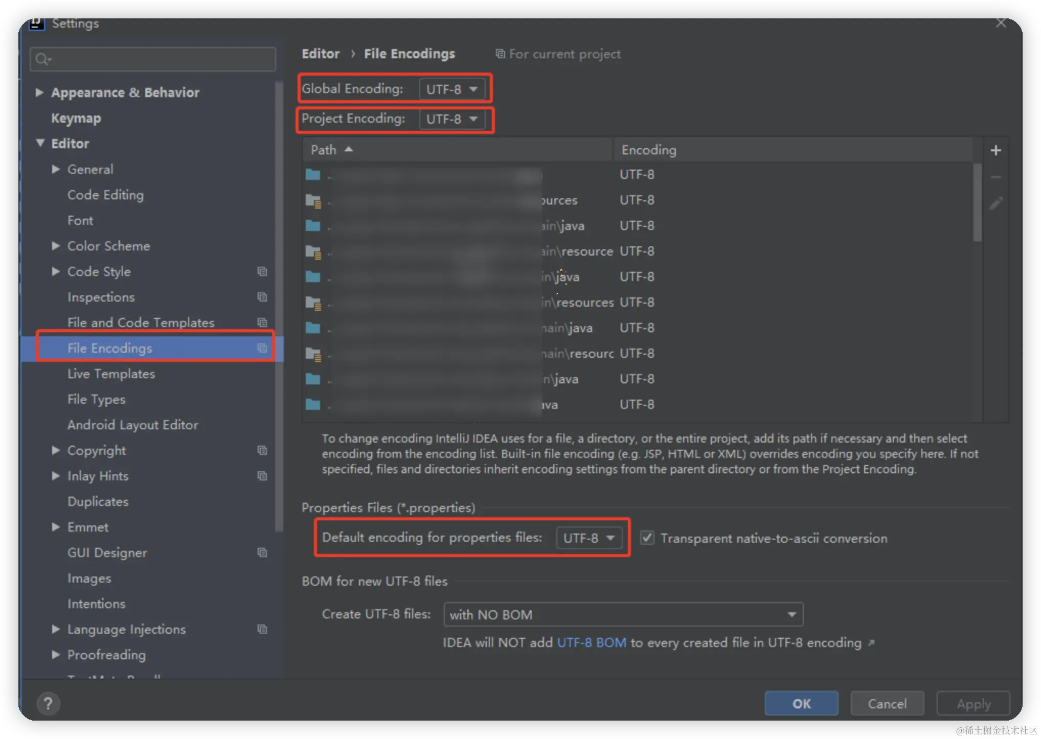 •具体操作:Settings --> Editor --> File Encodings --> Global Encoding | Project Encoding | Default encoding... | 勾选Transparent...