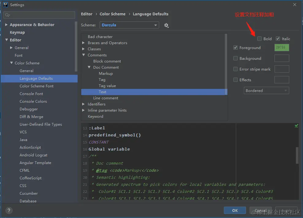 •具体操作:Settings --> Editor --> Color Scheme --> Language Defaults --> Comments --> Doc comment --> Text --> 勾选Bold