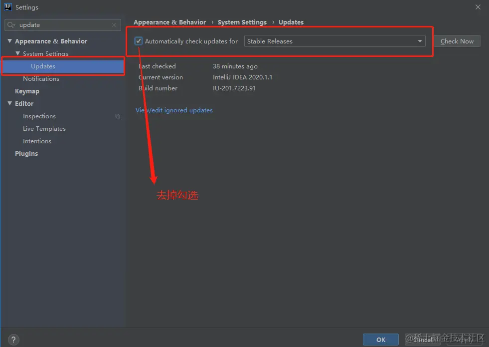 •具体操作:Settings --> 搜索update --> updates --> 取消勾选Automatically check updates...