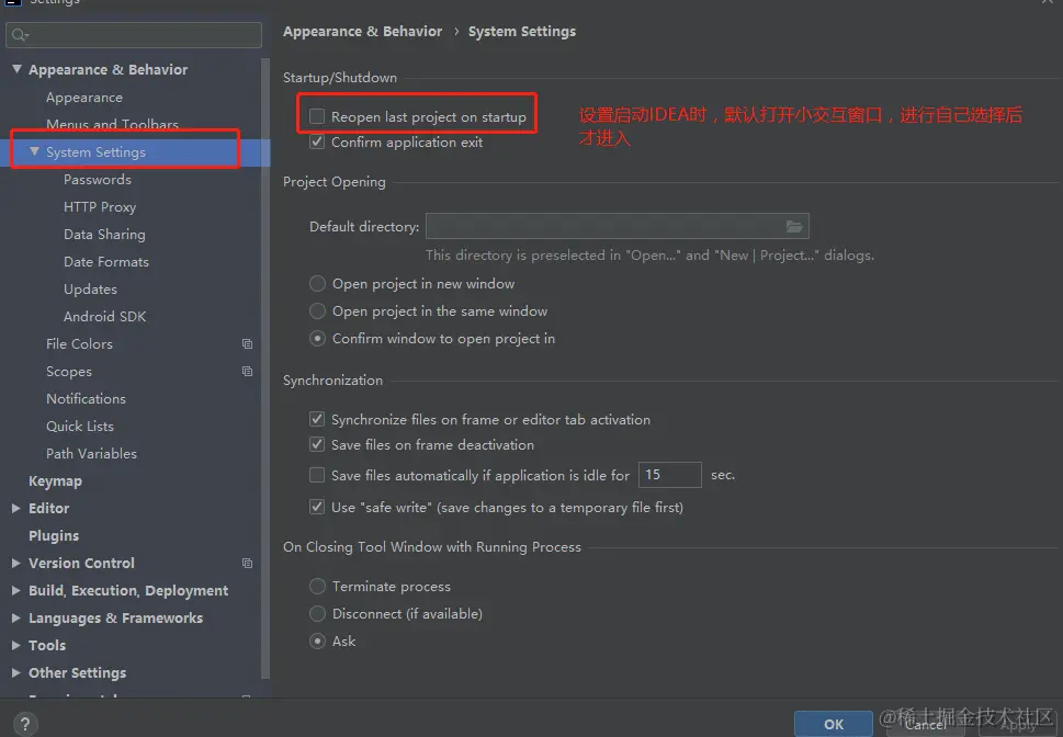 •Settings --> Appearance & Behavior --> System Settings【或者直接 Settings --> 搜素system settings】取消勾选Reopen last project on startup