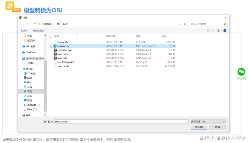 SVG转OBJ网站也支持通过拖拽的方式,将文件进行上传。在资源管理器中,选择一份或多份模型相关文件,拖拽至SVG转OBJ网站中的文件接收区域,即可完成3D模型文件的上传。