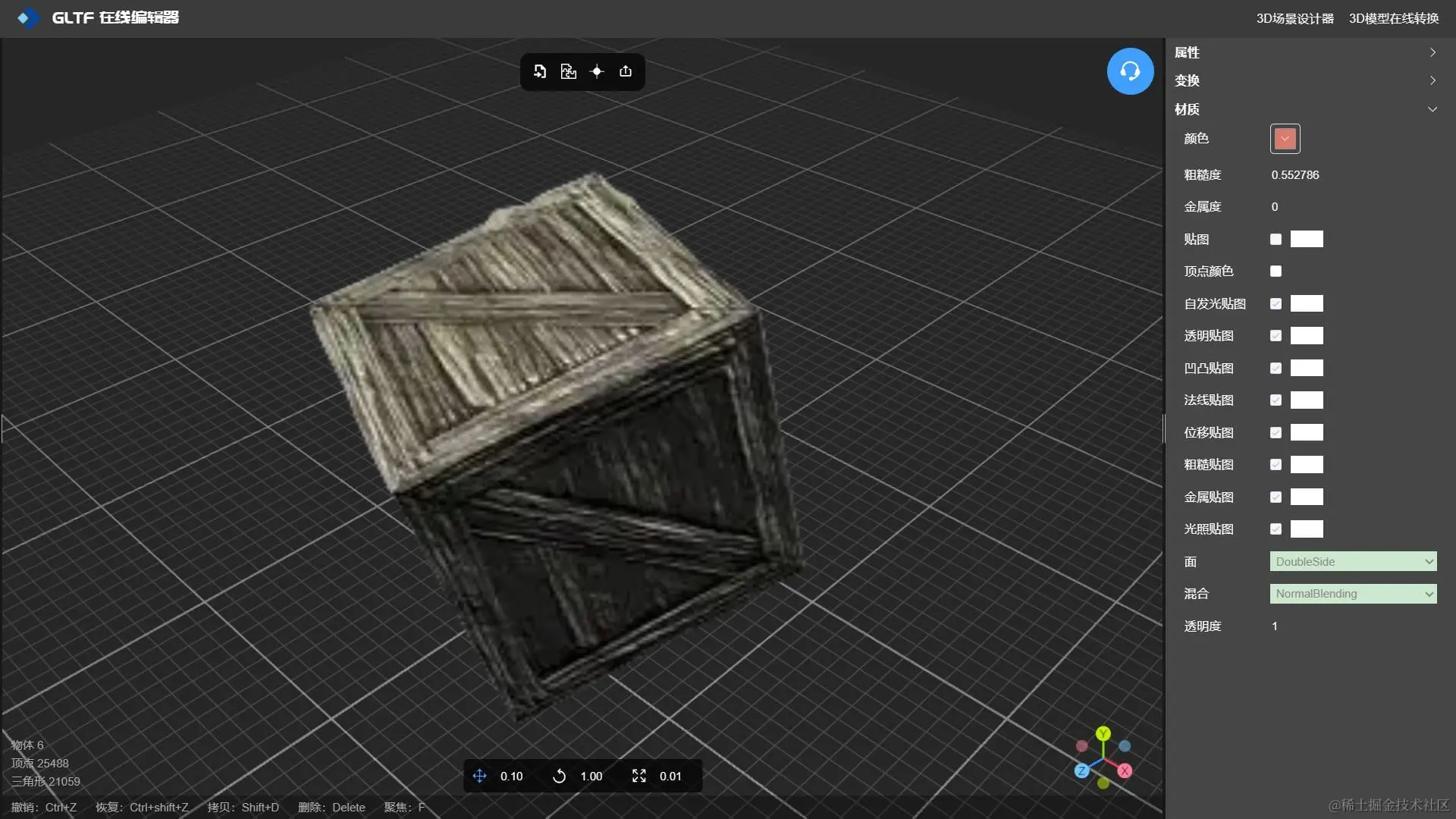 3.纹理贴图工具:GLTF 编辑器 -NSDT 是一款专门用于3D模型纹理贴图的工具,它支持3D模型各种材质纹理贴图的编辑修改,包括:颜色、粗糙度、金属度、贴图、顶点颜色、自发光贴图、透明贴图、凹凸贴图、法线贴图、位移贴图、粗糙贴图、金属贴图、光照贴图、透明度等。