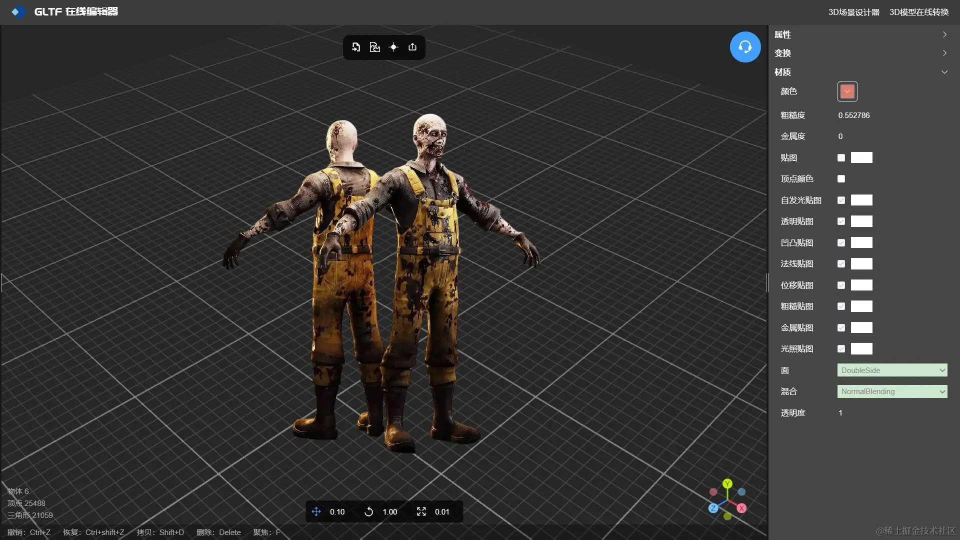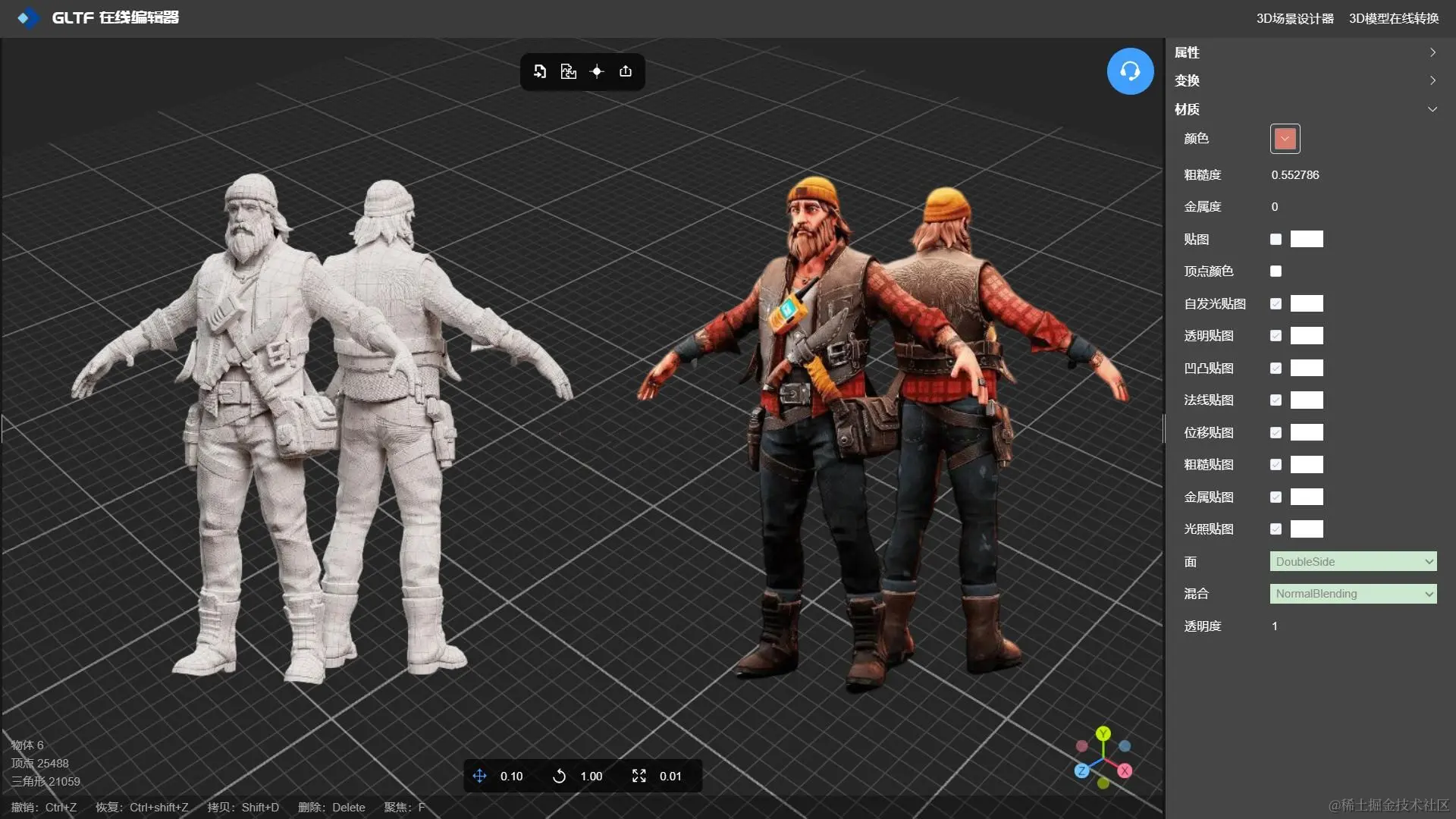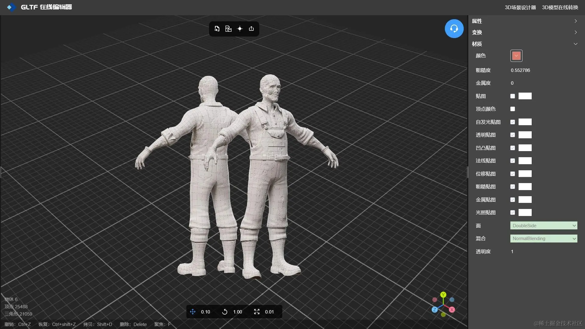 在选择合适的纹理工具时,请考虑项目的复杂性和您对软件的熟悉程度。初学者倾向于 GLTF 编辑器 -NSDT,GLTF 编辑器是一款专门用于3D模型纹理贴图的工具,它支持3D模型各种材质纹理贴图的编辑修改,包括:颜色、粗糙度、金属度、贴图、顶点颜色、自发光贴图、透明贴图、凹凸贴图、法线贴图、位移贴图、粗糙贴图、金属贴图、光照贴图、透明度等。