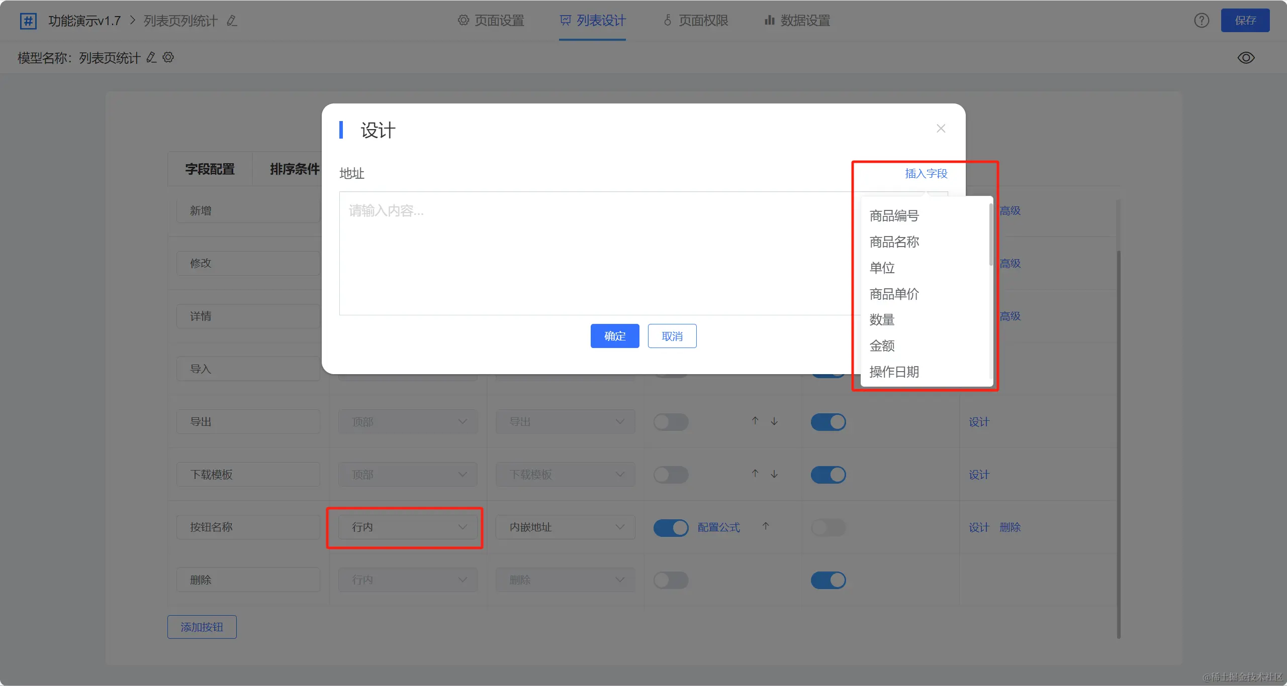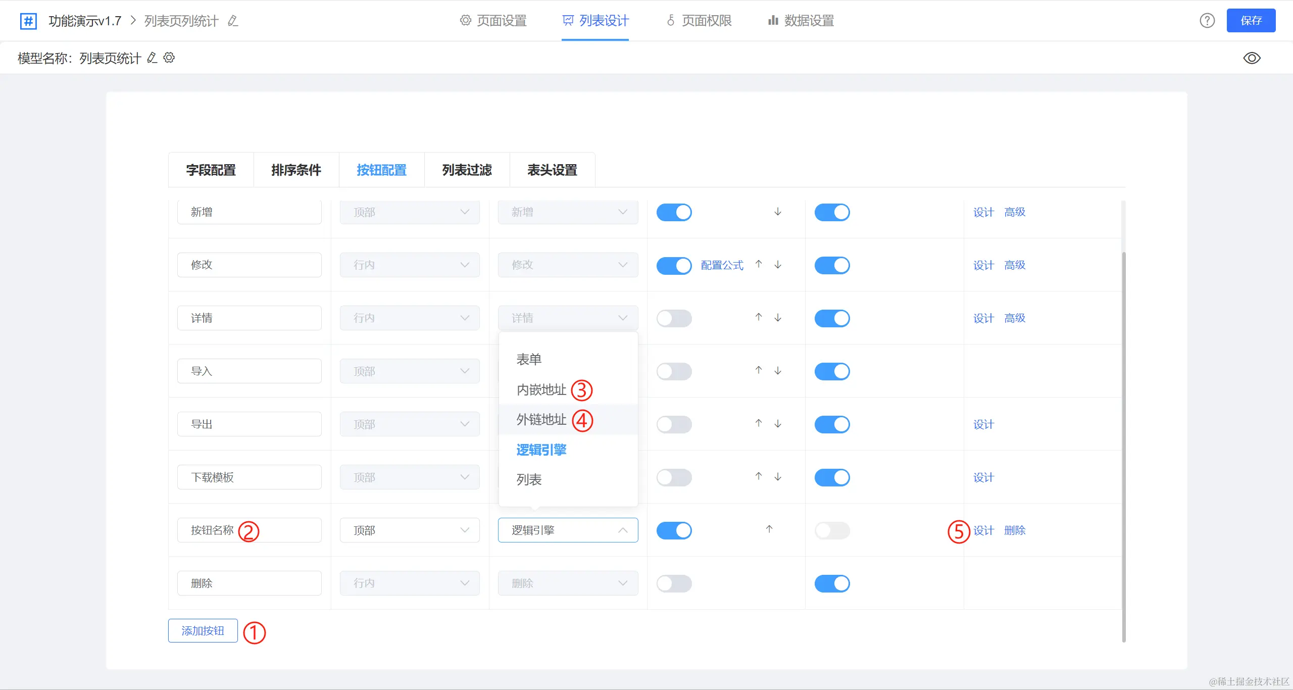 列表设计→添加按钮→按钮类型(内嵌地址、外链地址)→设计