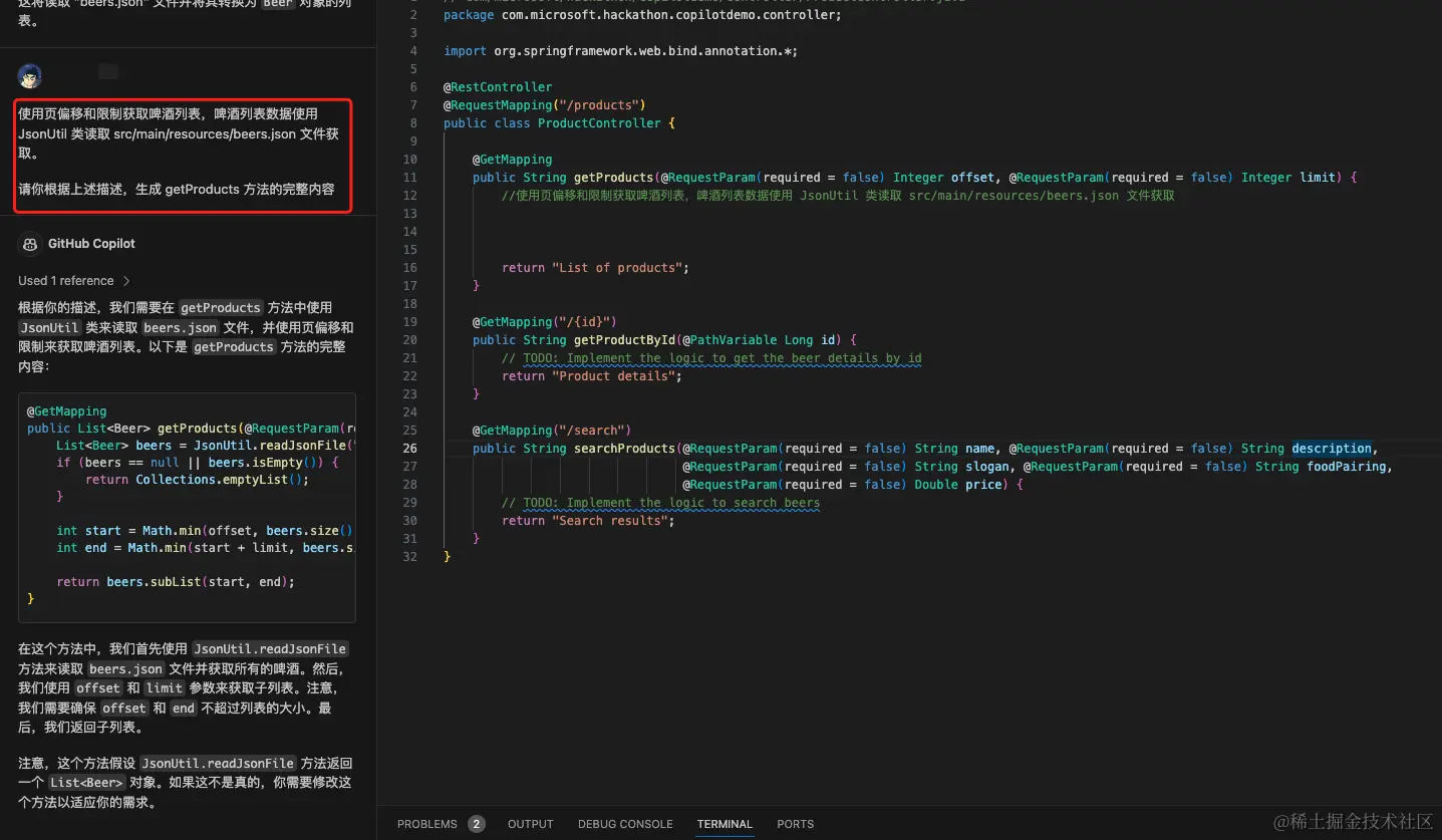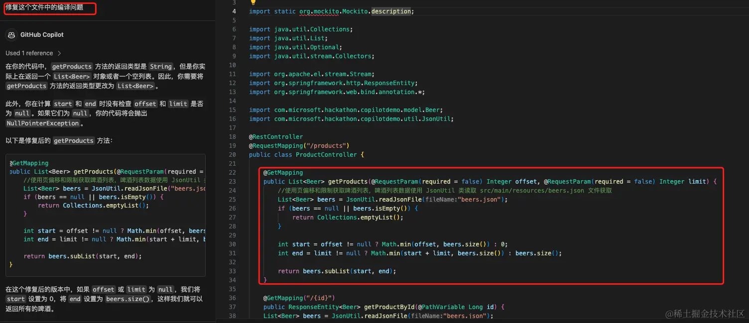 启动项目的时候,我们发现 ProductController.java 类有编译问题,我们让 Copilot 帮我们修复。