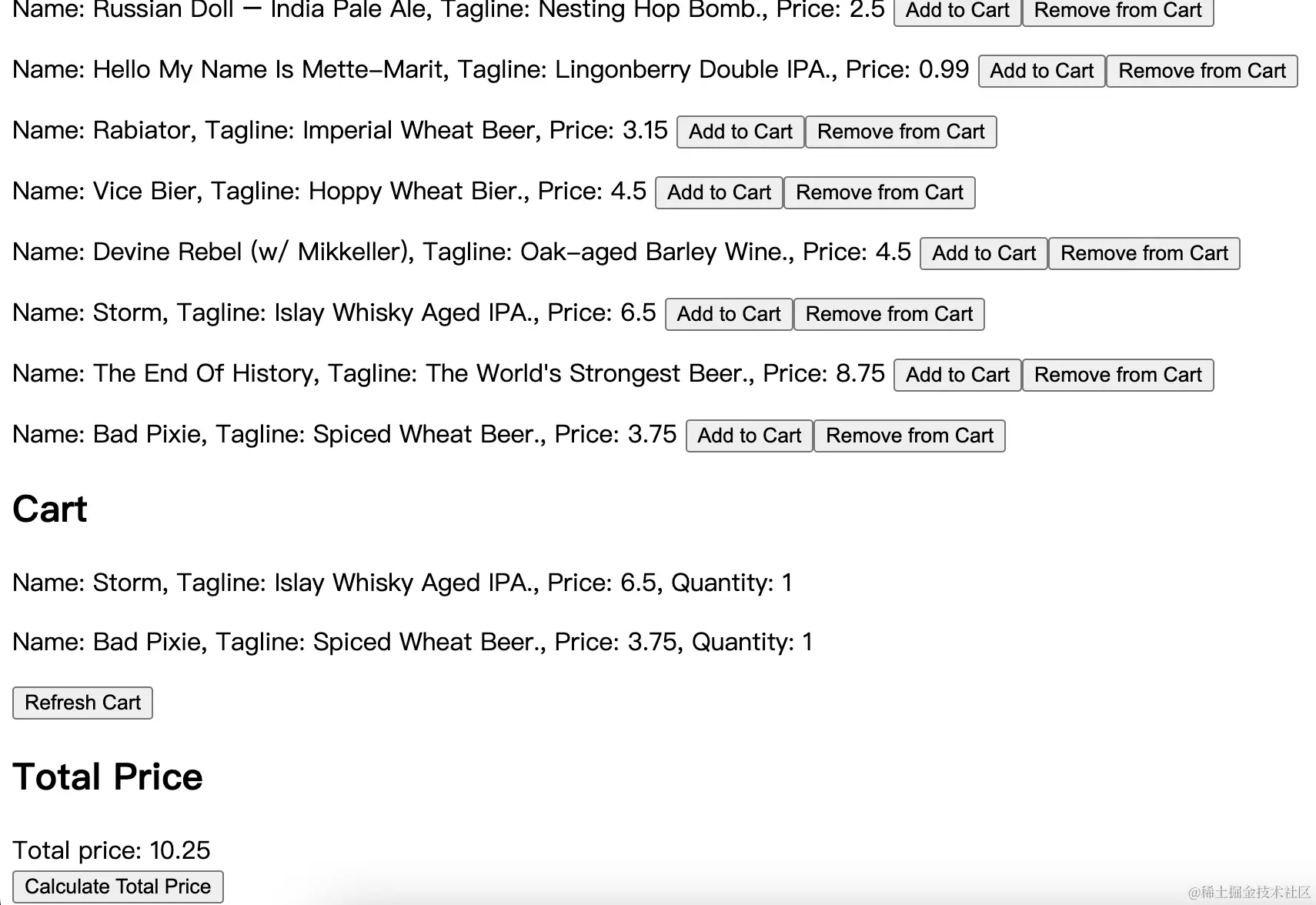 我们选择 Remove from Cart,Cart 列表中就会删除一个 beer 商品,Total Price 区域就会重新计算,扣减这个 beer 商品的价格。