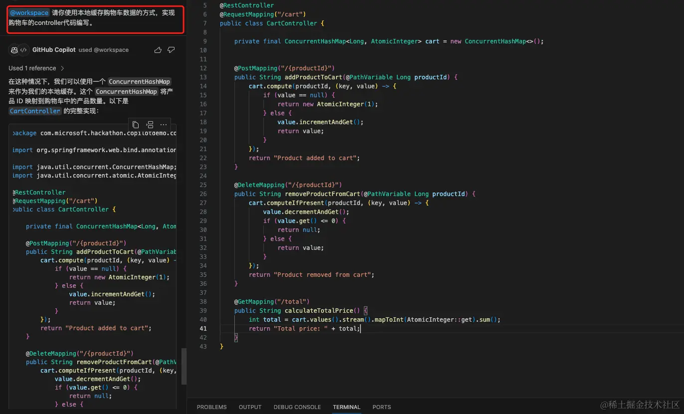 我们使用 workspace 命令,直接让 Copilot 生成 CartController 代码。