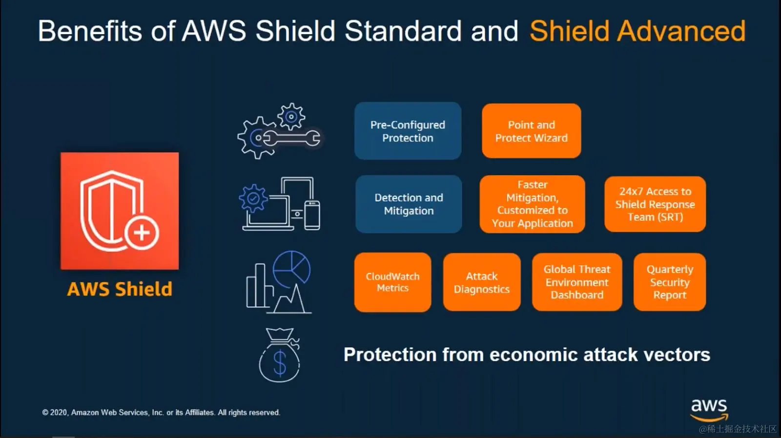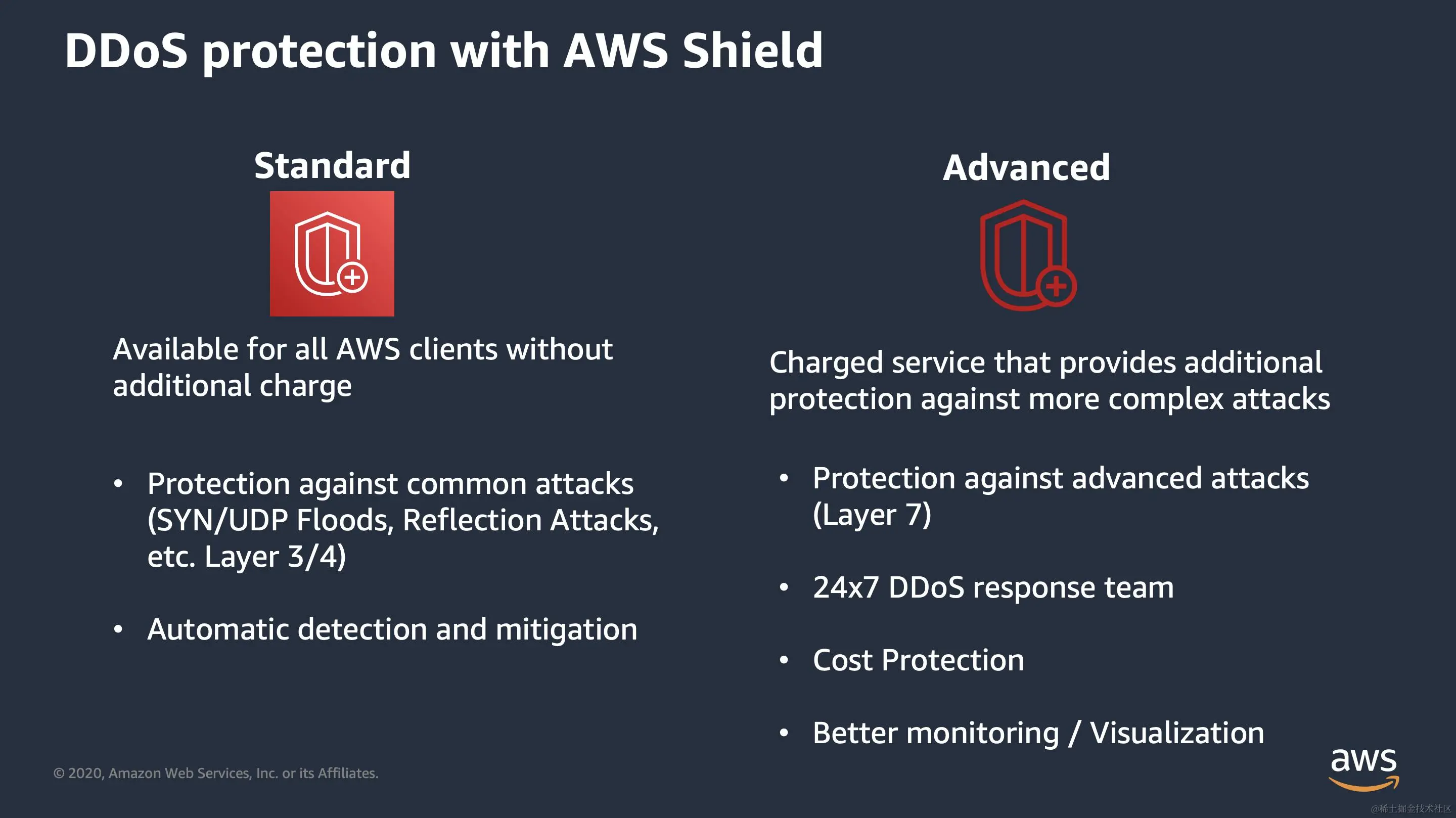 AWS Shield是 AWS 提供的 DDoS 防护服务。它提供两层保护:AWS Shield Standard 和 AWS Shield Advanced。