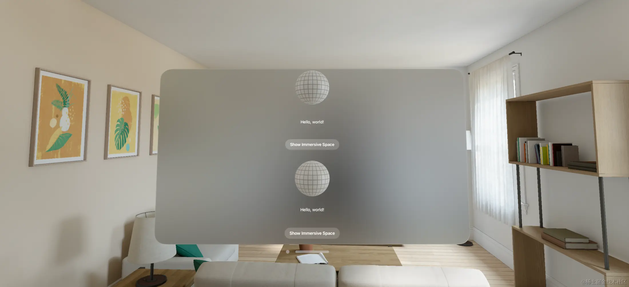 初始 visionOS 项目页面如下,有一个ContentView,其中包含了一个 3D 的模型和一个按钮。并在 App 中,定义了一个WindowGroup来渲染ContentView。在 visionOS 中,默认会打开 App 类中定义的第一个 Scene,这里就是ContentView。