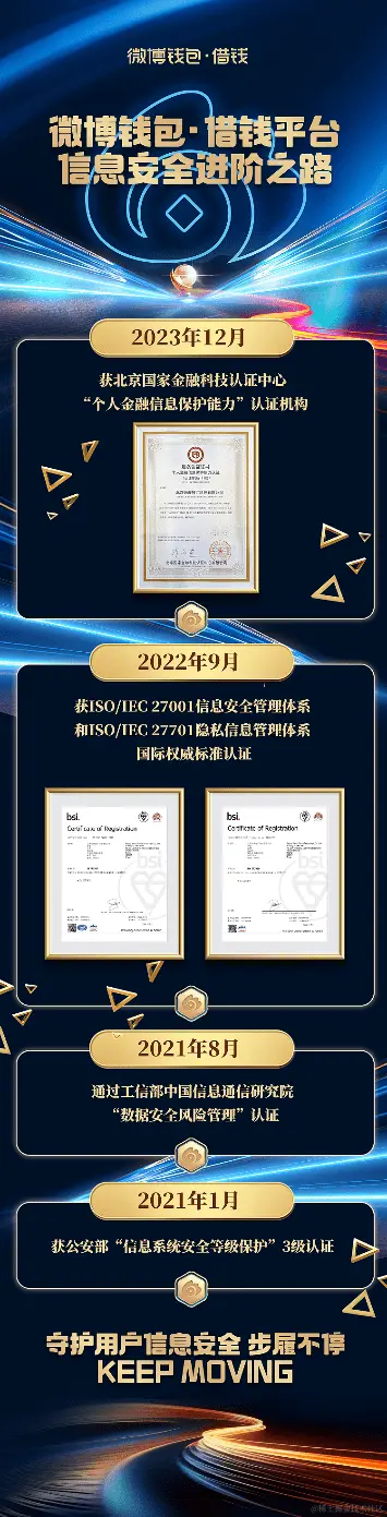 作为新浪旗下数字科技服务平台,新浪数科是为数不多同时通过ISO/IEC 27001和ISO/IEC 27701国际标准认证的数字科技企业之一,综合金融服务微博钱包、信贷服务微博借钱、数据处理、风控决策等业务流程中的数据和隐私安全处置能力均达到认证标准。此前,新浪数科曾凭借数据风险管理能力通过工信部中国信息通信研究院“数据安全风险管理”认证及“卓信大数据计划”专项评估,并获公安部“信息系统安全等级保护”3级认证。