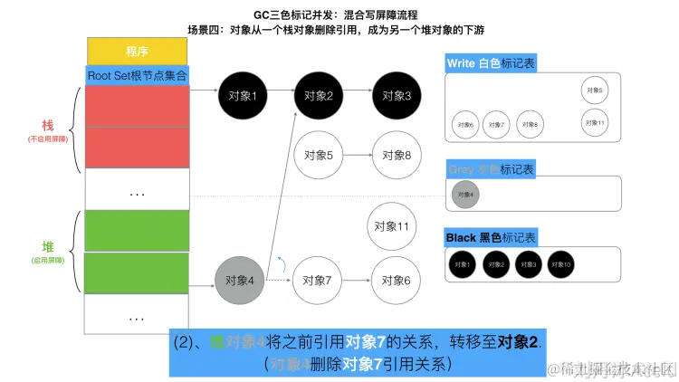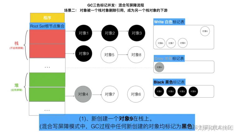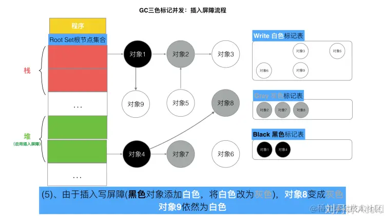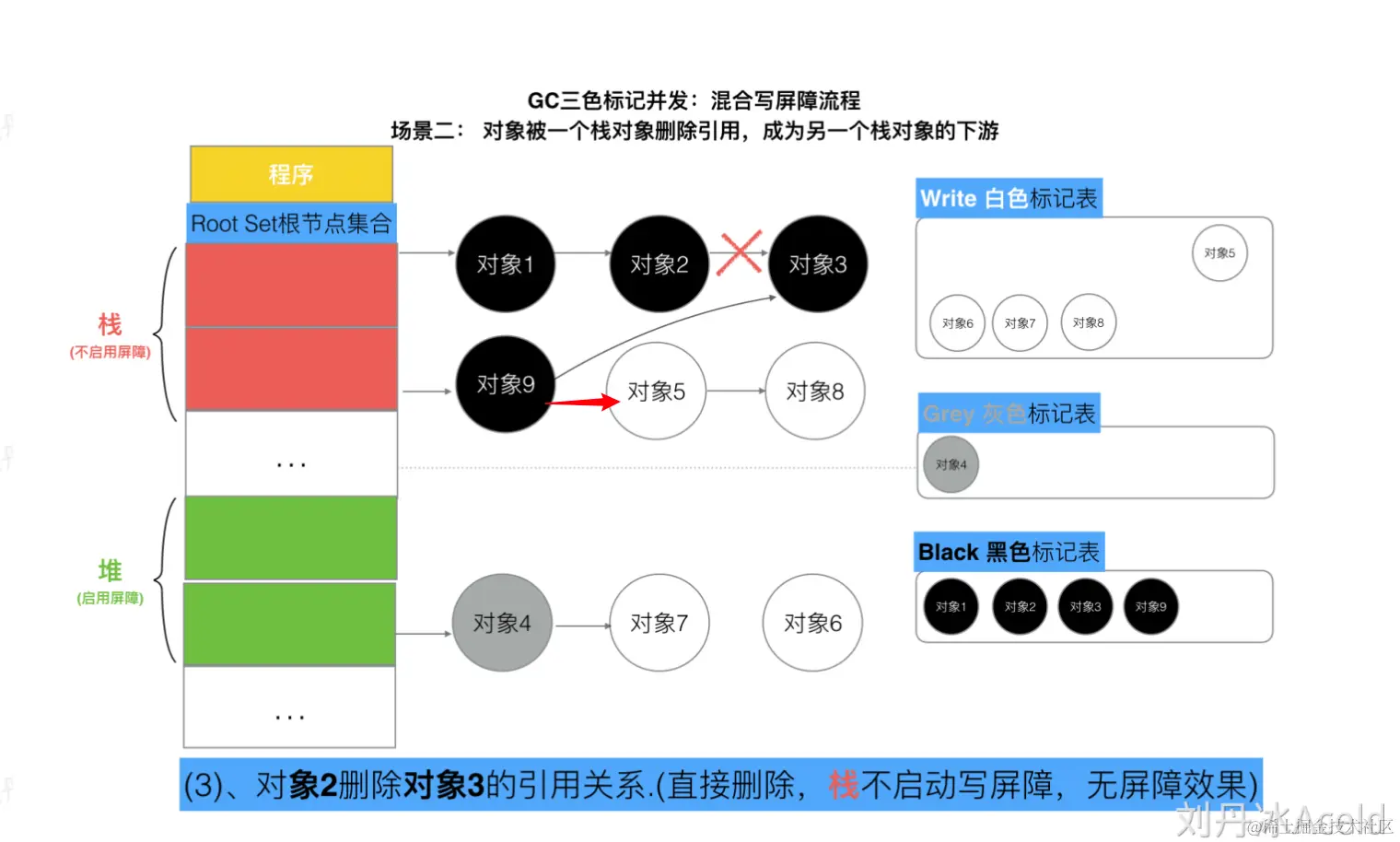 如上图所示:如果对象9引用对象5,栈上没有屏障,对象5最终还是白色的 这样不会造成误删除吗? 混合写屏障是对堆使用的,对栈不使用,如果栈中黑色对象引用一个白色对象,没有写屏障,最后白色的要被回收的,我们对此造成了困扰。