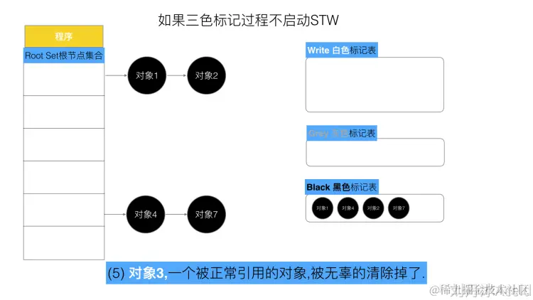 先抛砖引玉,我们加入如果没有STW,那么也就不会再存在性能上的问题,那么接下来我们假设如果三色标记法不加入STW会发生什么事情?