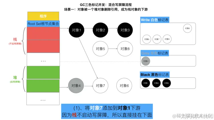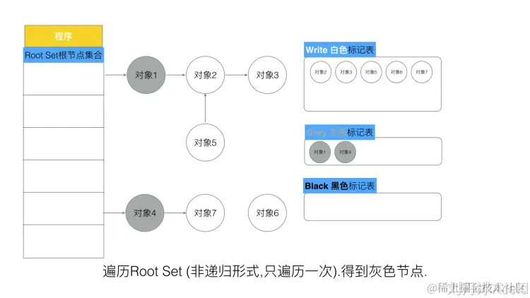 GC开始:扫描栈区,将可达对象全部标记为黑