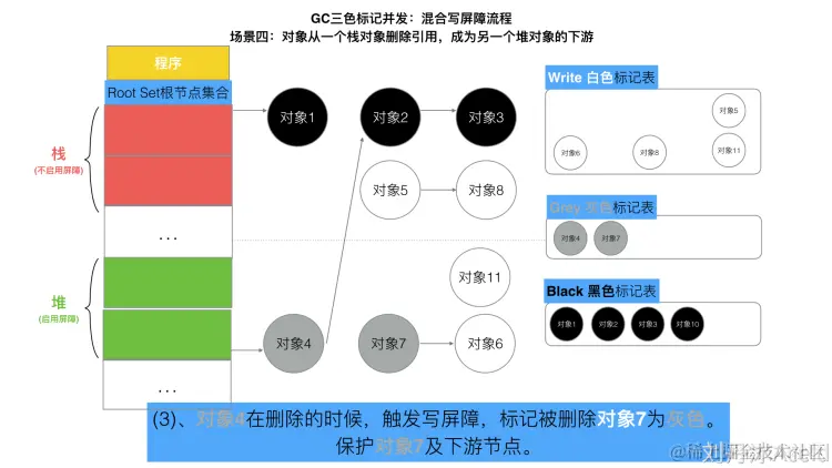 具体操作: 被删除的对象,如果自身为灰色或者白色,那么被标记为灰色。