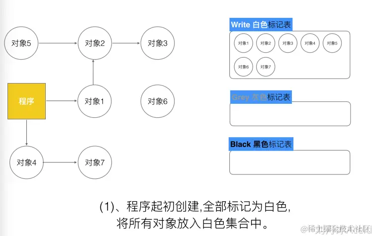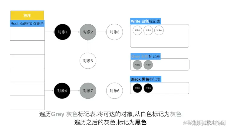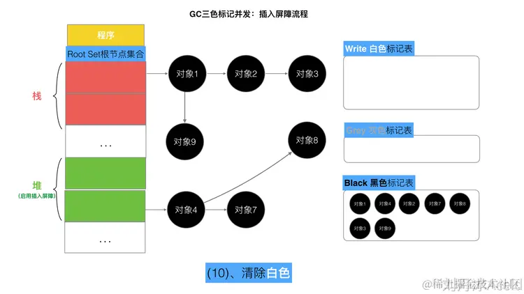 当我们全部的可达对象都遍历完后,灰色标记表将不再存在灰色对象,目前全部内存的数据只有两种颜色,黑色和白色。那么黑色对象就是我们程序逻辑可达(需要的)对象,这些数据是目前支撑程序正常业务运行的,是合法的有用数据,不可删除,白色的对象是全部不可达对象,目前程序逻辑并不依赖他们,那么白色对象就是内存中目前的垃圾数据,需要被清除。