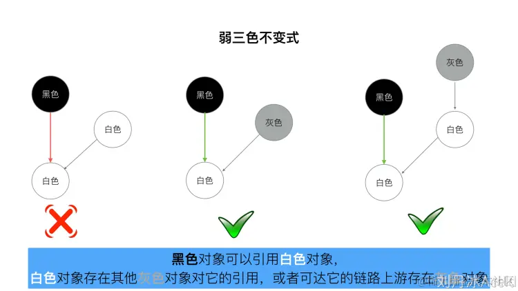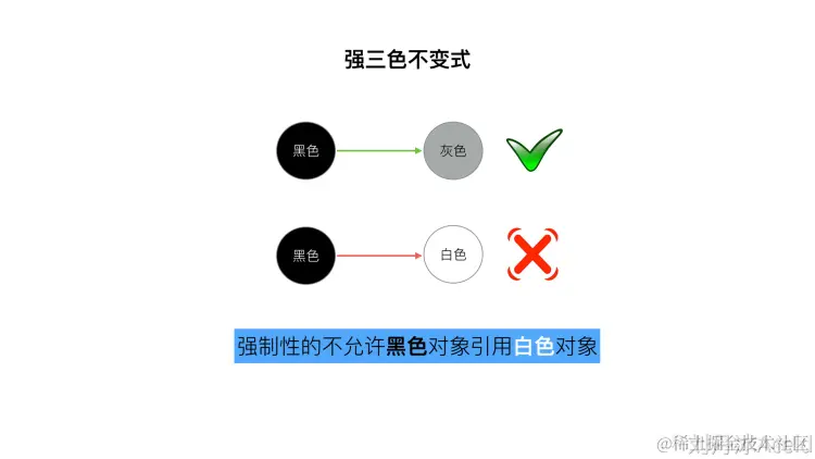 强三色不变色实际上是强制性的不允许黑色对象引用白色对象,这样就不会出现有白色对象被误删的情况。