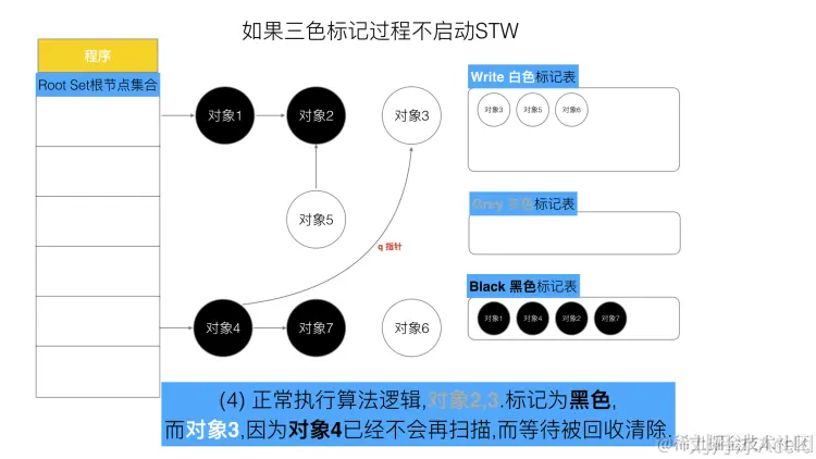 现在如何三色标记过程不启动STW,那么在GC扫描过程中,任意的对象均可能发生读写操作,如图所示,在还没有扫描到对象2的时候,已经标记为黑色的对象4,此时创建指针q,并且指向白色的对象3。