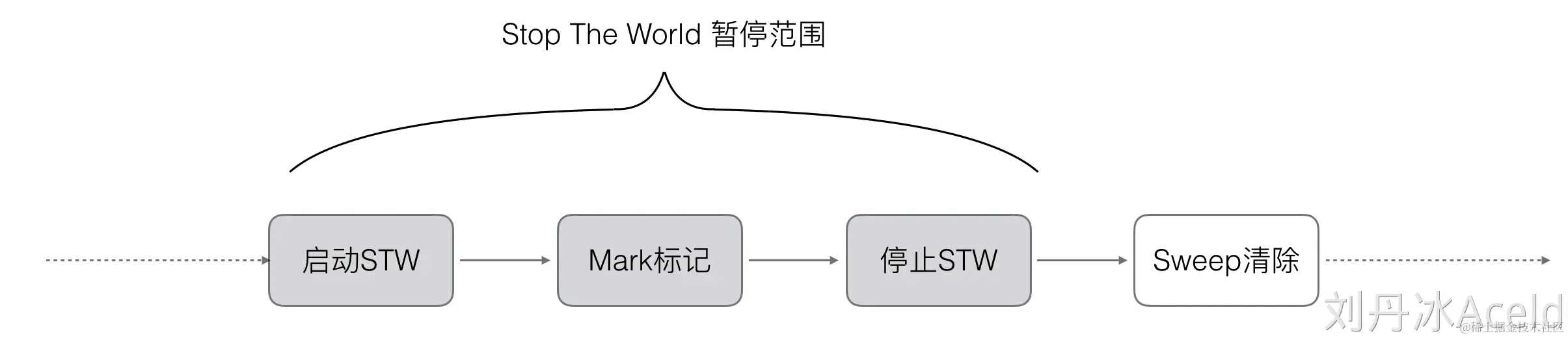 上图主要是将STW的步骤提前了一步,因为在Sweep清除的时候,可以不需要STW停止,因为这些对象已经是不可达对象了,不会出现回收写冲突等问题。