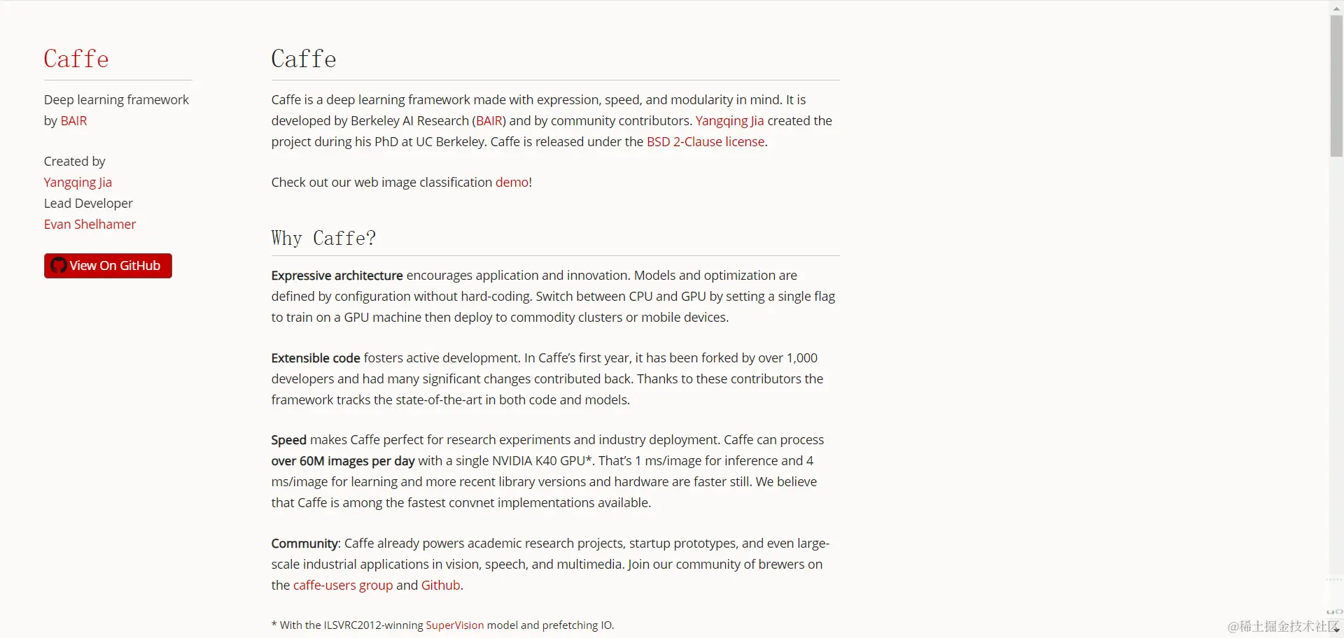 Caffe(Convolutional Architecture for Fast Feature Embedding)(快速特征嵌入的卷积架构)是一个开源的深度学习框架,最初由加州大学伯克利分校的Yangqing Jia开发。 2017年4月,Facebook发布了Caffe2,其中包含了递归神经网络(RNN)等新功能。2018年3月底,Caffe2被并入PyTorch。