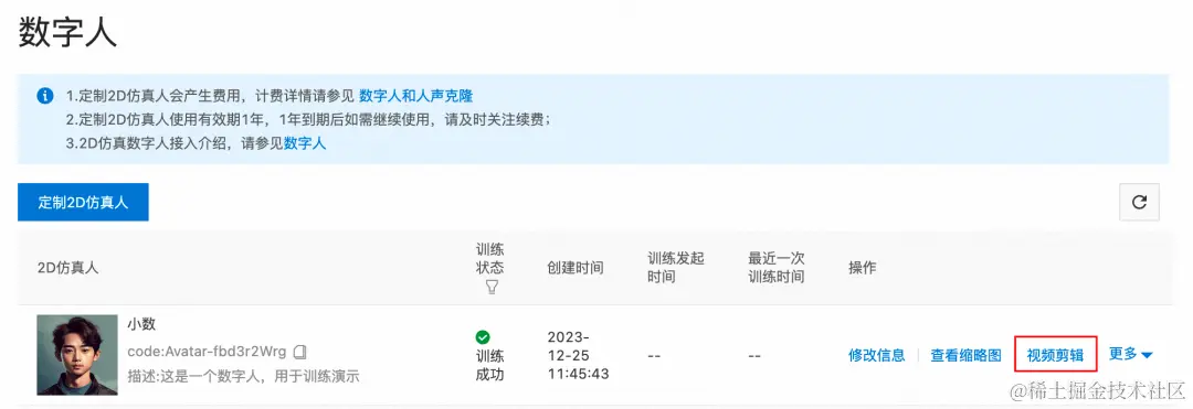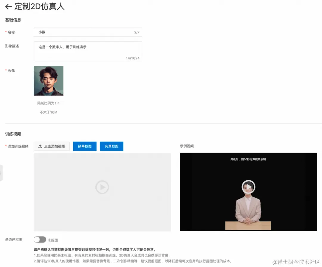 通过控制台进行提交训练,依据提示,填入数字人名称、描述、头像图片与训练视频素材等,点击「开始定制」,即可开始训练。