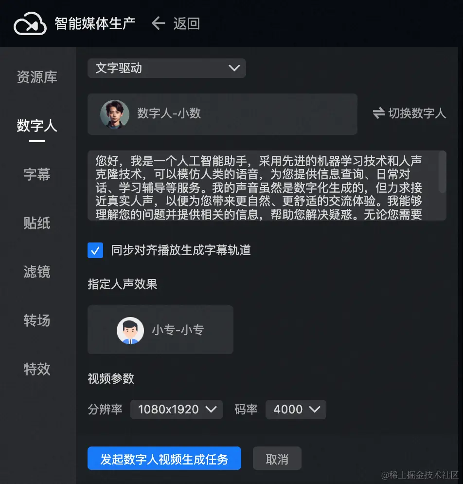 以「文字驱动」为例:输入文本内容,选择官方人声效果 (亦可选择通过人声克隆生成的声音模型,详见第二步) 即可生成数字人视频。