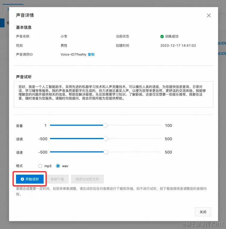 输入文字内容,点击「开始试听」按钮,即可提交智能语音合成。