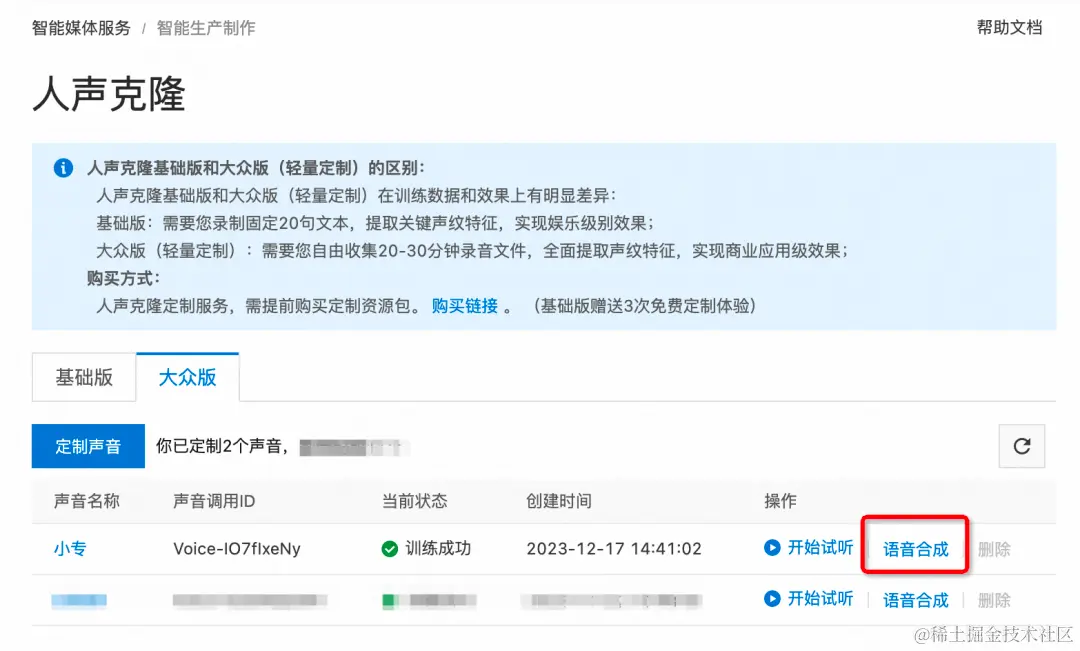 训练完成后,您将获得模型的唯一标识 VoiceId,可以通过点击「人声克隆 - 大众版」列表页中的「语音合成」按钮,来使用当前声音模型进行语音合成。