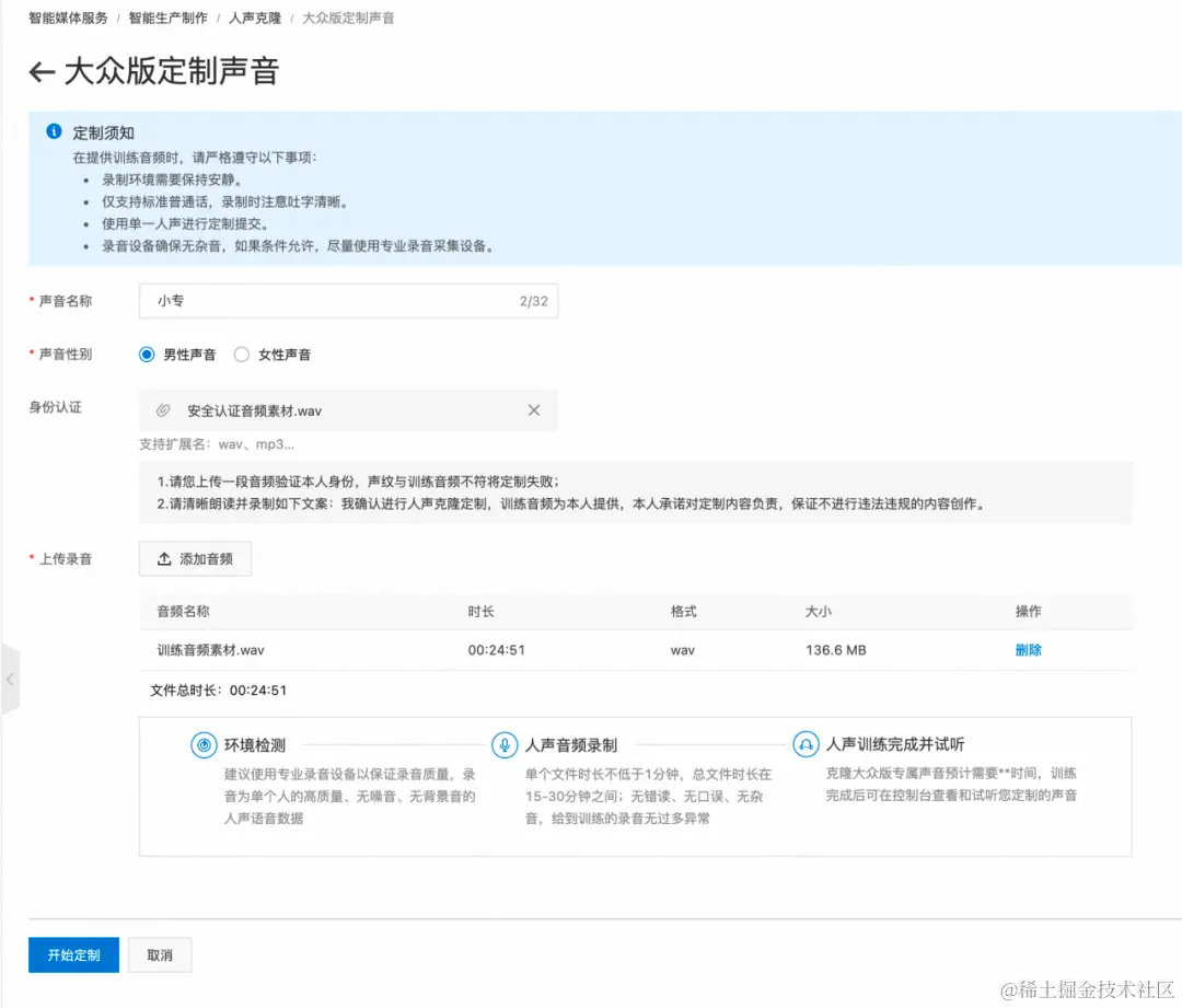 通过控制台提交训练,填入声音名称、安全认证音频、训练音频等,点击「开始定制」,即可开始训练。