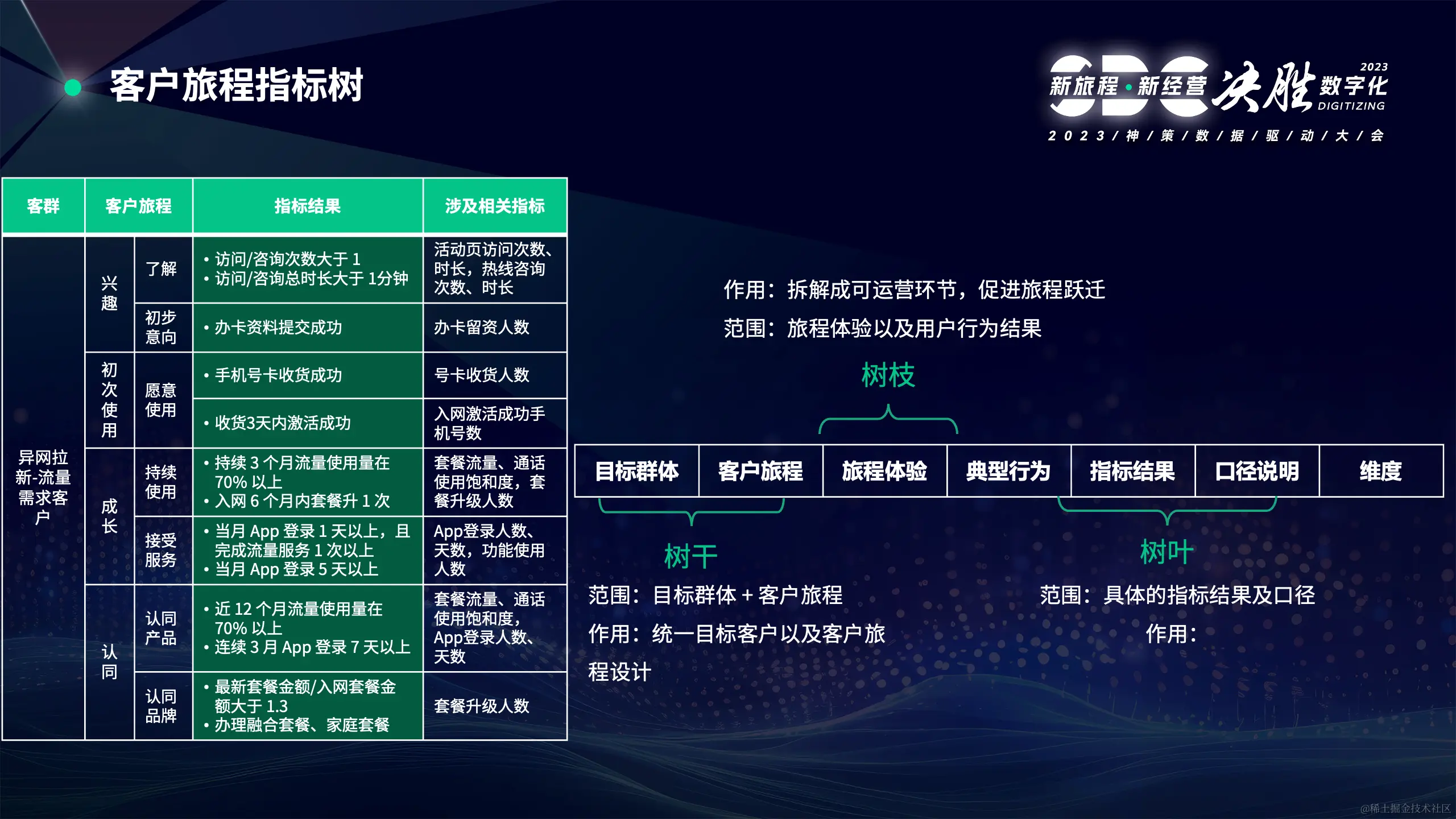 旅程指标有三个:基于事先假设的业务知识,设计数据汇聚计算规则,所得到的客户旅程描述体系。旅程指标是为了解决业务问题可量化、可验证,以此为依据持续优化业务表现。