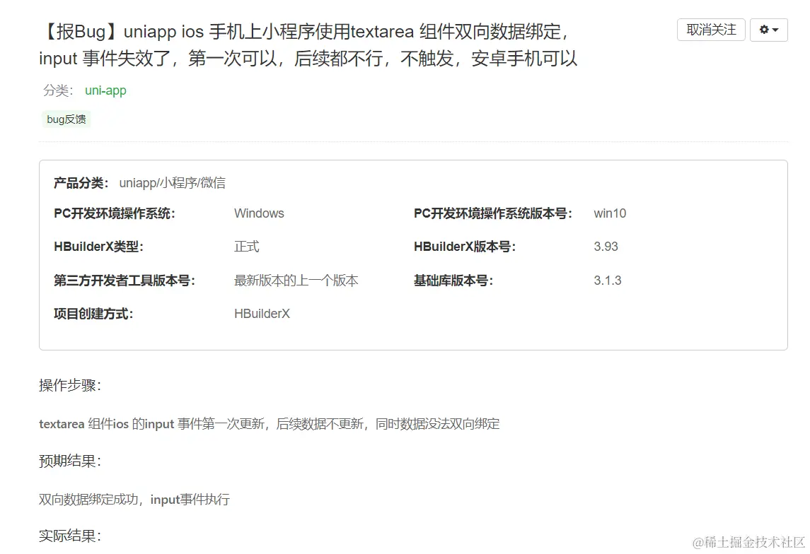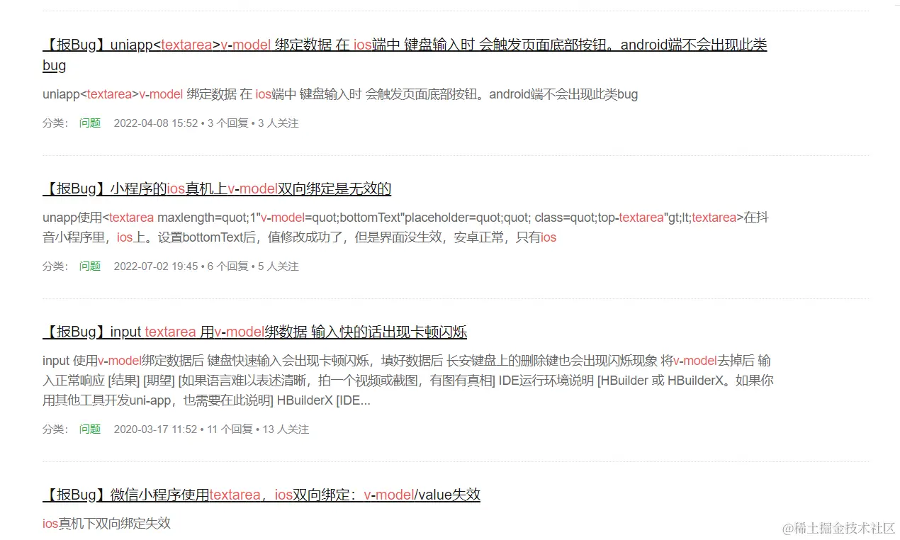 最后. ios textarea 的@input有概率会触发页面中其他元素的事件,例如@change,@click等,官方问答社区页挺多类似的bug
