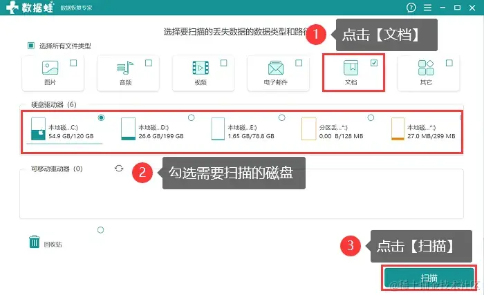 第2步:若只需要恢复表格文件,勾选【文档】 ,并勾选需要恢复的文档删除前所在的磁盘,点击 【扫描】;