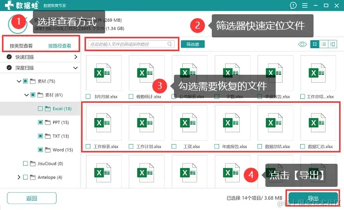 第4步:深度扫描完成后,有机会恢复的数据都会呈现出来,此时用户可选择按文件的类型或文件的路径对结果进行查看,找到相应文件后,将其勾选上,点击【导出】 。