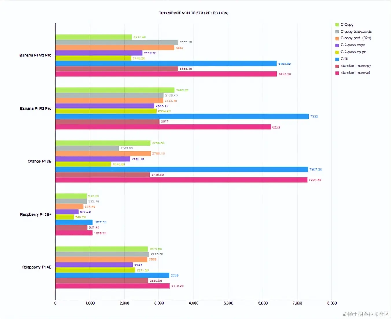 板载 2 GB LPDDR4 RAM(标记为 Rayson RS512M32LZ4D2ANP-75BT),频率为 1333 MHz。Sysbench RAM和Timymembench向我们展示了32位总线和基于Cortex-A55内核的处理器(例如Youyeetoo YY3568)的数值特征。