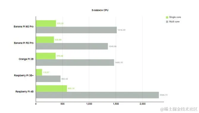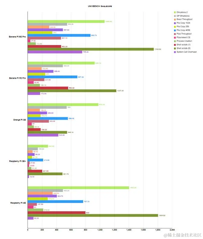 BPi-M2 pro 的核心是与 BPi-M5 相同的多媒体 Amlogic S905X3 SoC。我们经常在低端或旧型号的机顶盒中找到它。其四个节能 A55 核心工作频率为 1.9 GHz,为了稳定运行,应安装无源冷却器。Sysbench CPU 以及传奇的 Unixbench 向我们展示了其性能介于 Raspberry Pi 3 和 4 之间,与 RK3566 板(例如Orange Pi 3B)相当。
