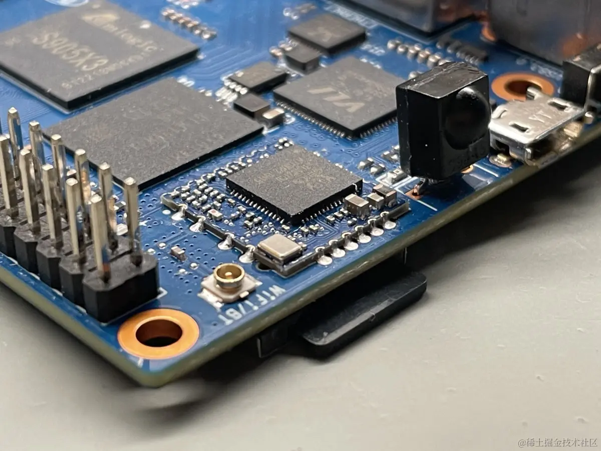 侧面是Realtek RTL8821CU模块,提供802.11 b/g/n/ac WiFi 5和蓝牙4.2。板上还有一个用于 Wi-Fi/BT 天线的 U.FL 连接器。它们旁边是一个红外接收器,如果该板要用作多媒体中心的核心,那么这是合理的。最后是一个微型 USB OTG 端口。