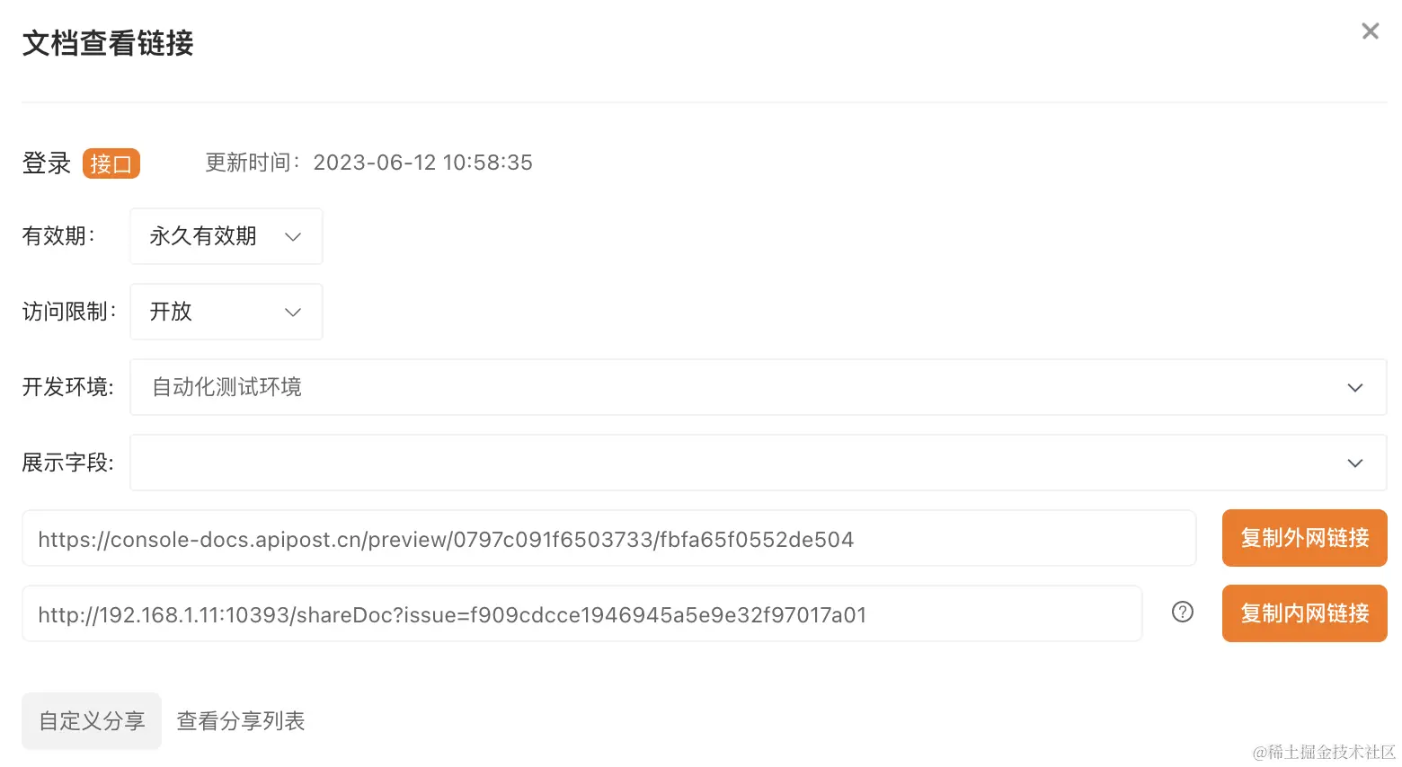 一键快速生成文档: 简化接口文档撰写,提高效率。填写接口参数后,点击“分享文档”按钮即可自动生成漂亮、规范的文档,支持自定义分享有效期和权限。