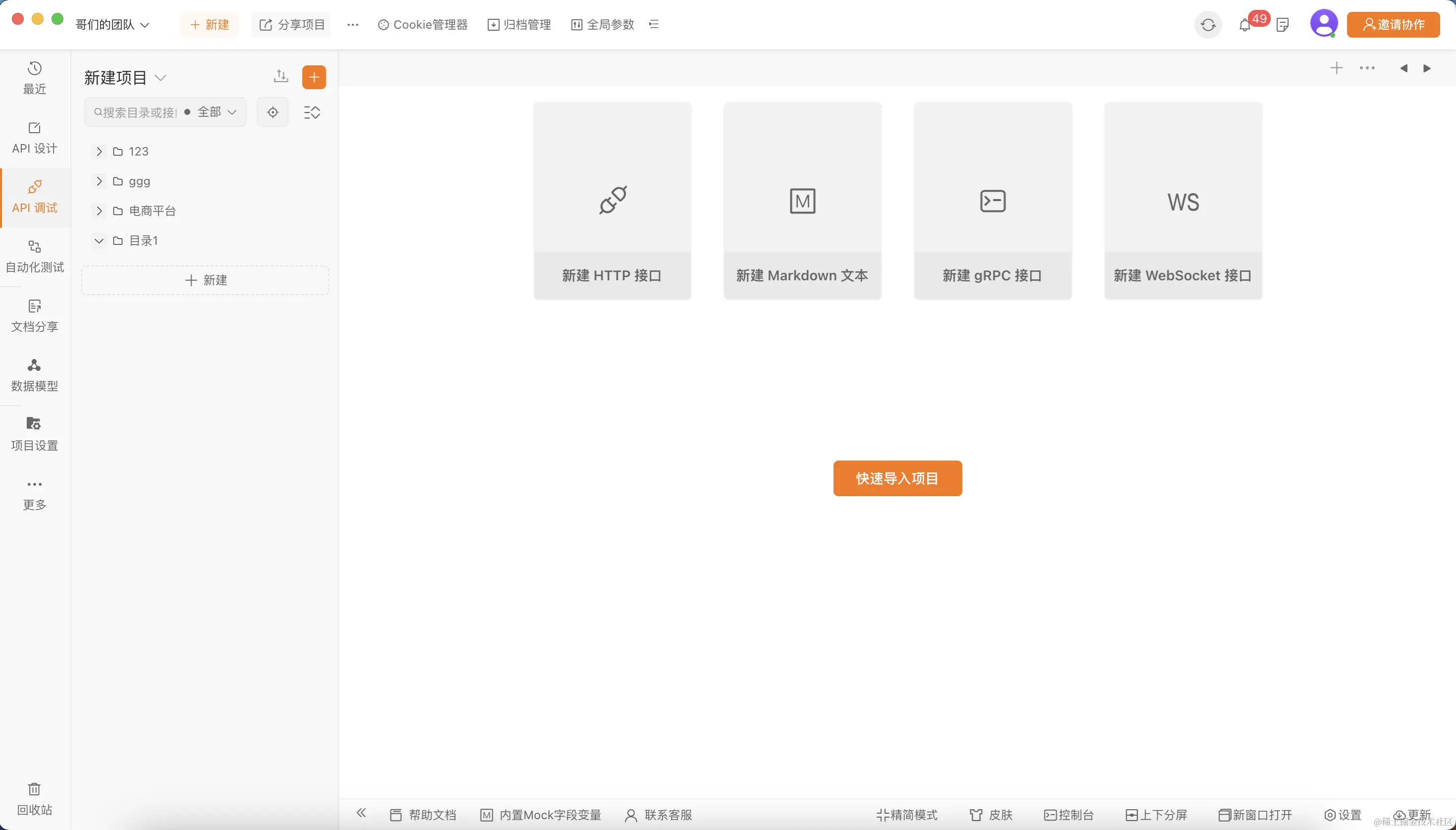 安装Apipost后,打开软件后,我们来看看首页面的一些功能:有API设计、API调试、自动化测试、文档分享、数据模型、项目设置等几大模块。