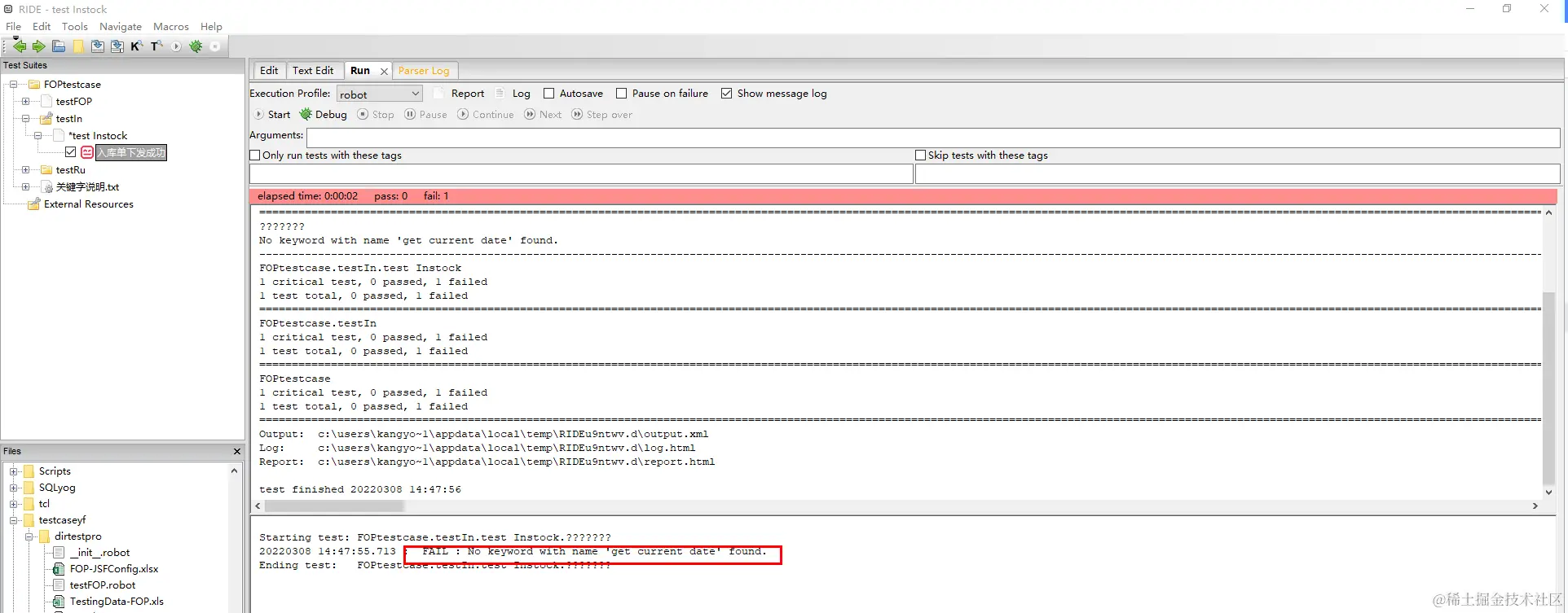 在这里我们可以看到明显的报错,就不需要去Report里查看了,如果当我们的报错不能明显看到时,我们需要去Report里查看具体的报错信息,Report会标记报错在哪一行,这样方便定位问题,言归正传,我们看到这个报错时没有发现get current date的主键,好我们去引入下这个库(具体引入库的讲解上边已经说过了哈)