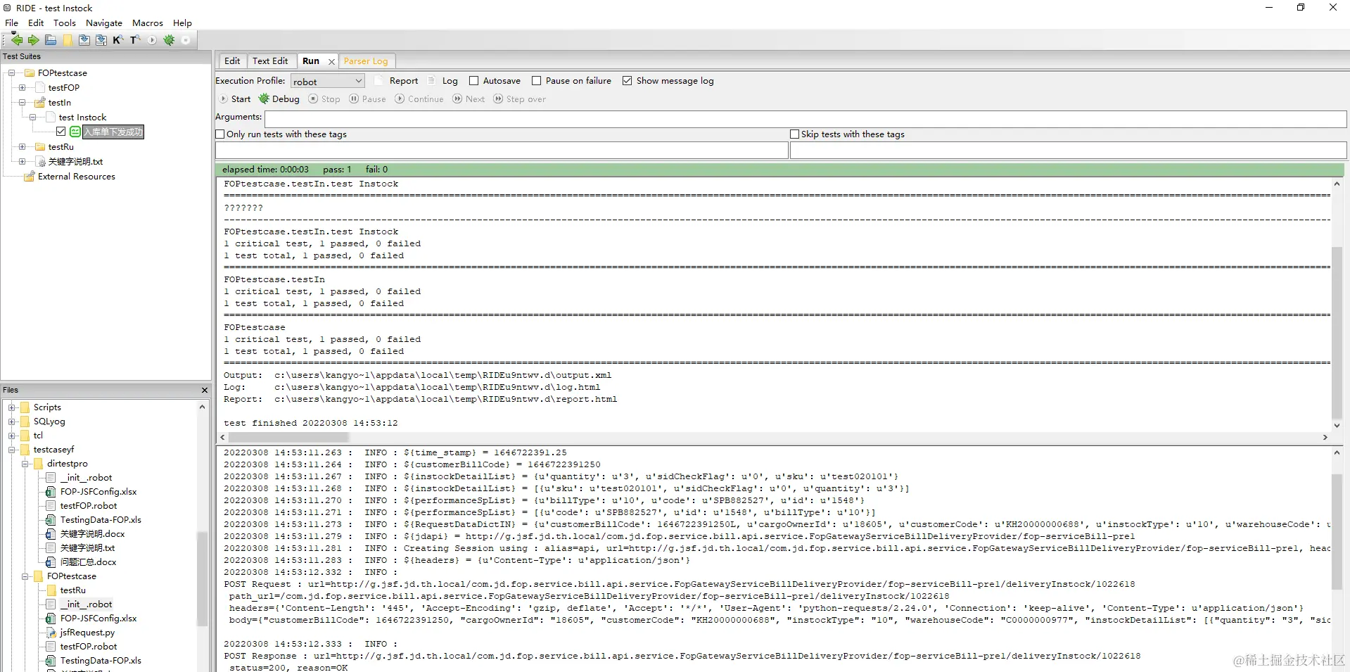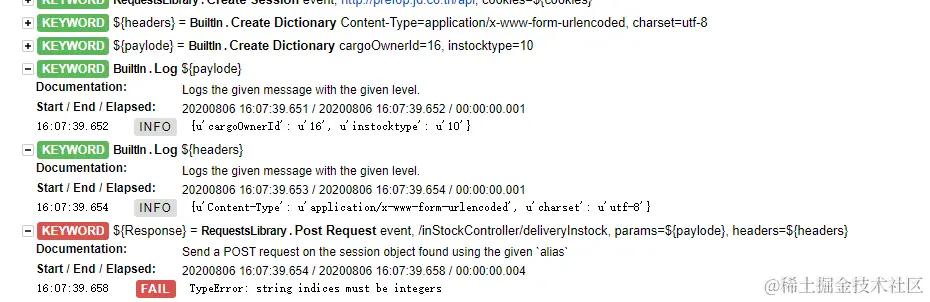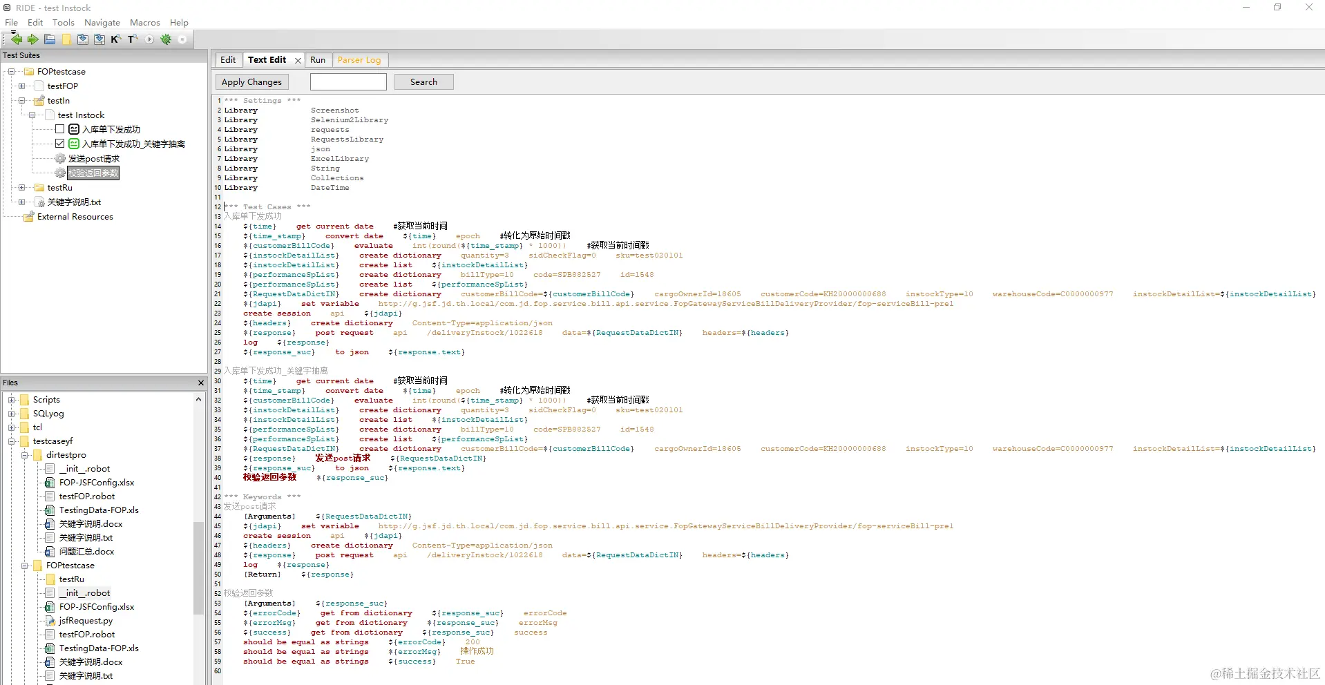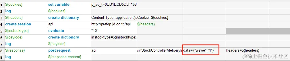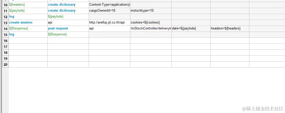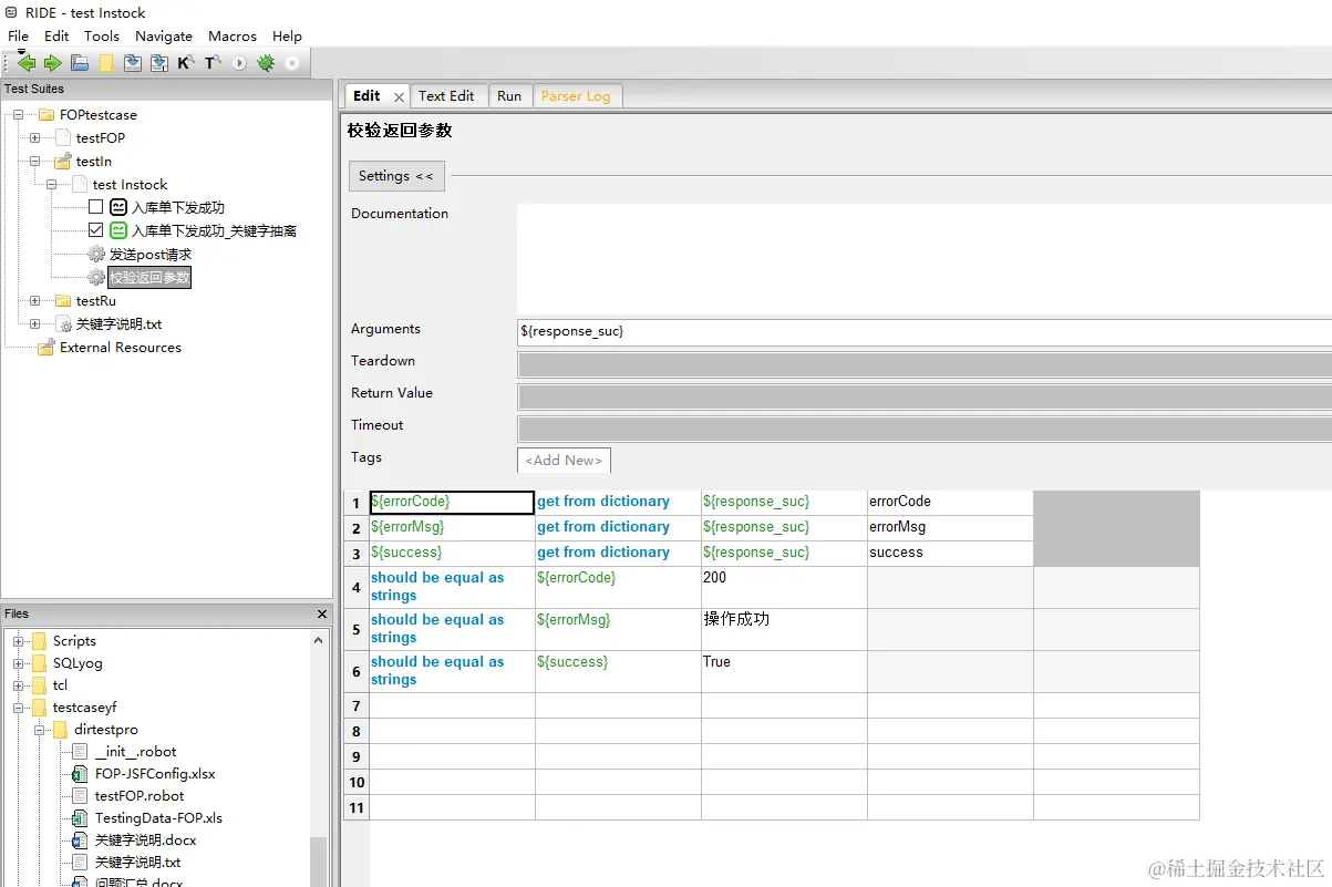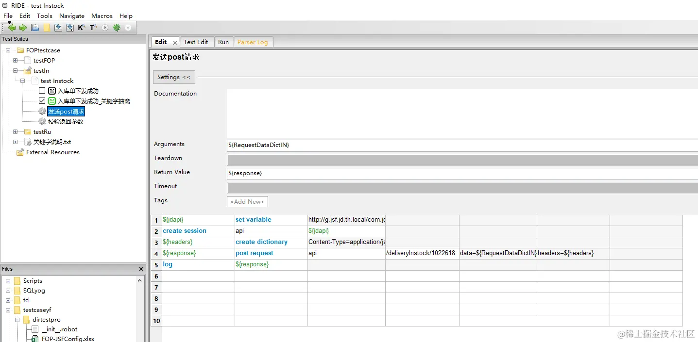 因我们有很多其他类似接口,这里我们可以把发送post请求部分和校验返回参数部分单独以关键字的方式实现:test Instock—>New User Keyword,创建关键字,名称我们叫它“发送post请求”和“校验返回参数”吧!