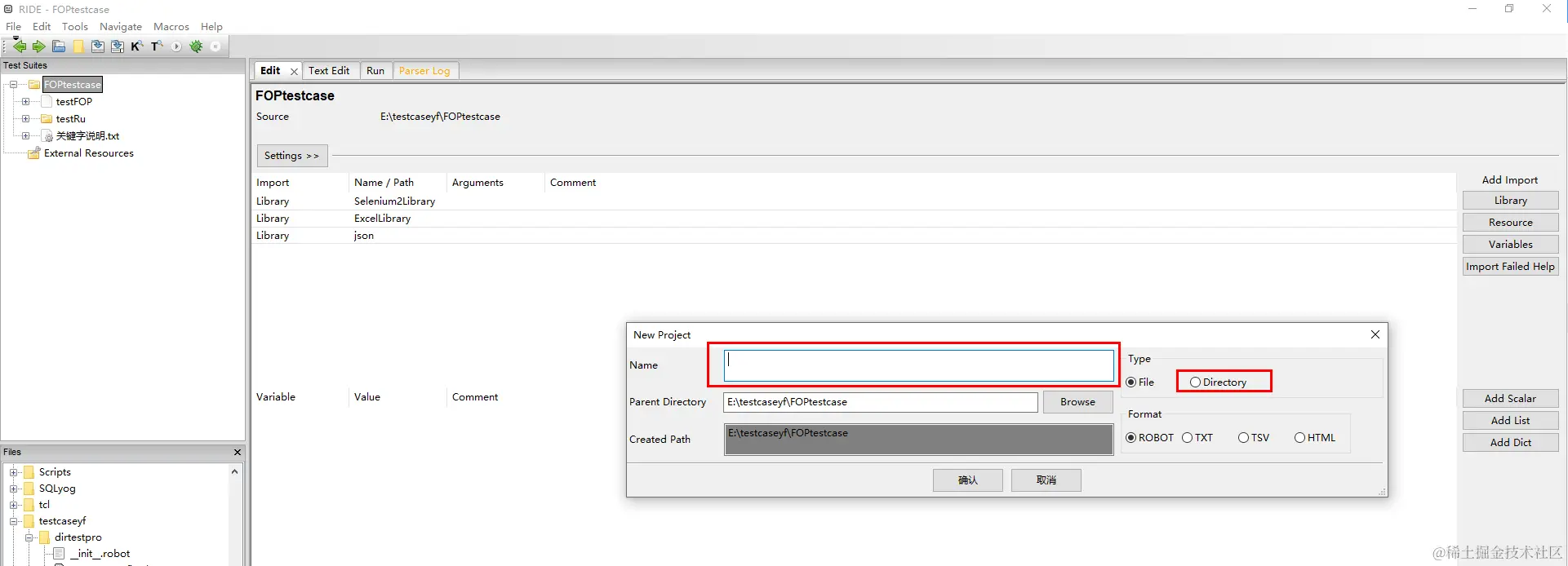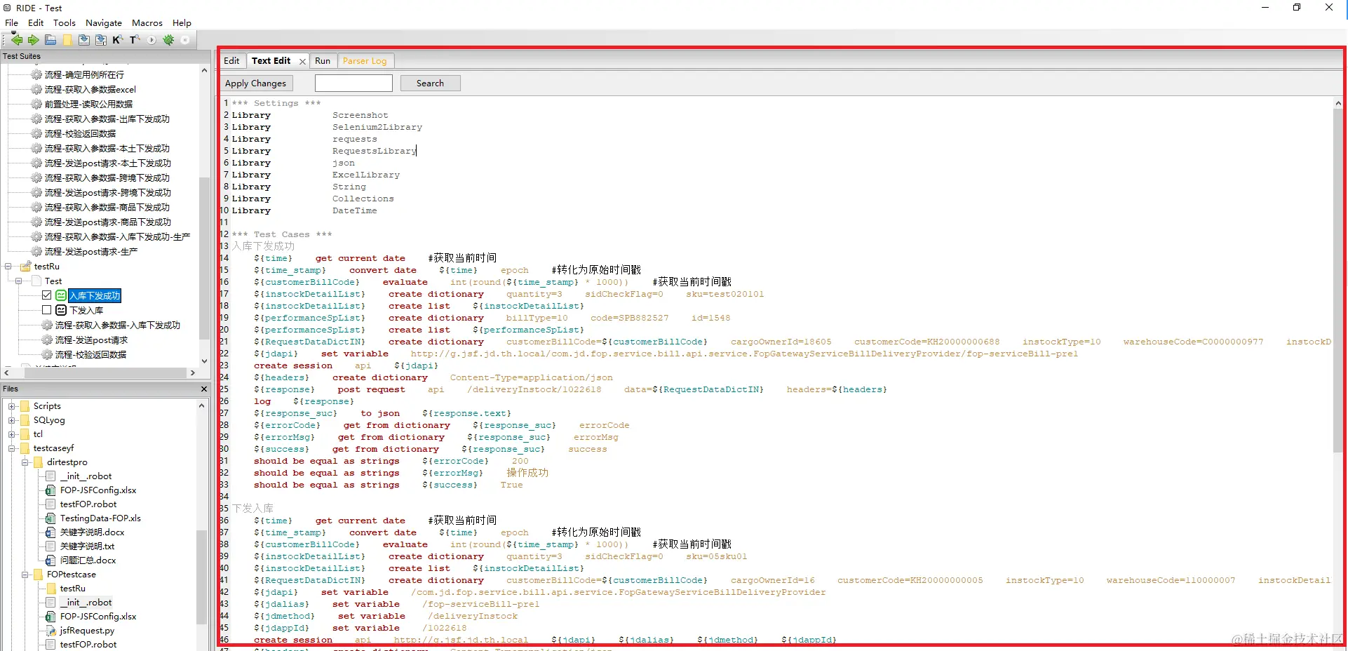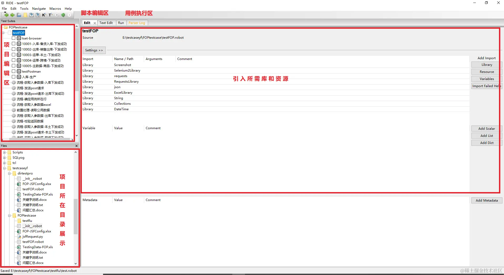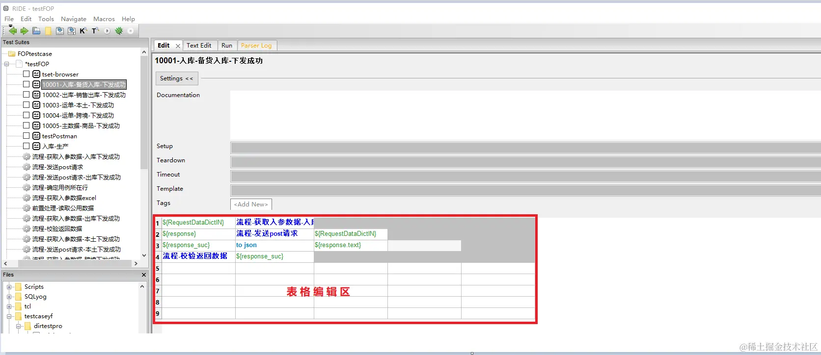 - 项目编辑区会展示我们已经创建的项目、用例和已经创建的关键字资源;这里的关键字可以为我们以后的用例带来很多方便,适用于写通用的逻辑,方便我们在用例编写时遇到相同的逻辑去调用;