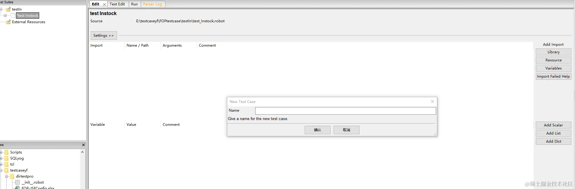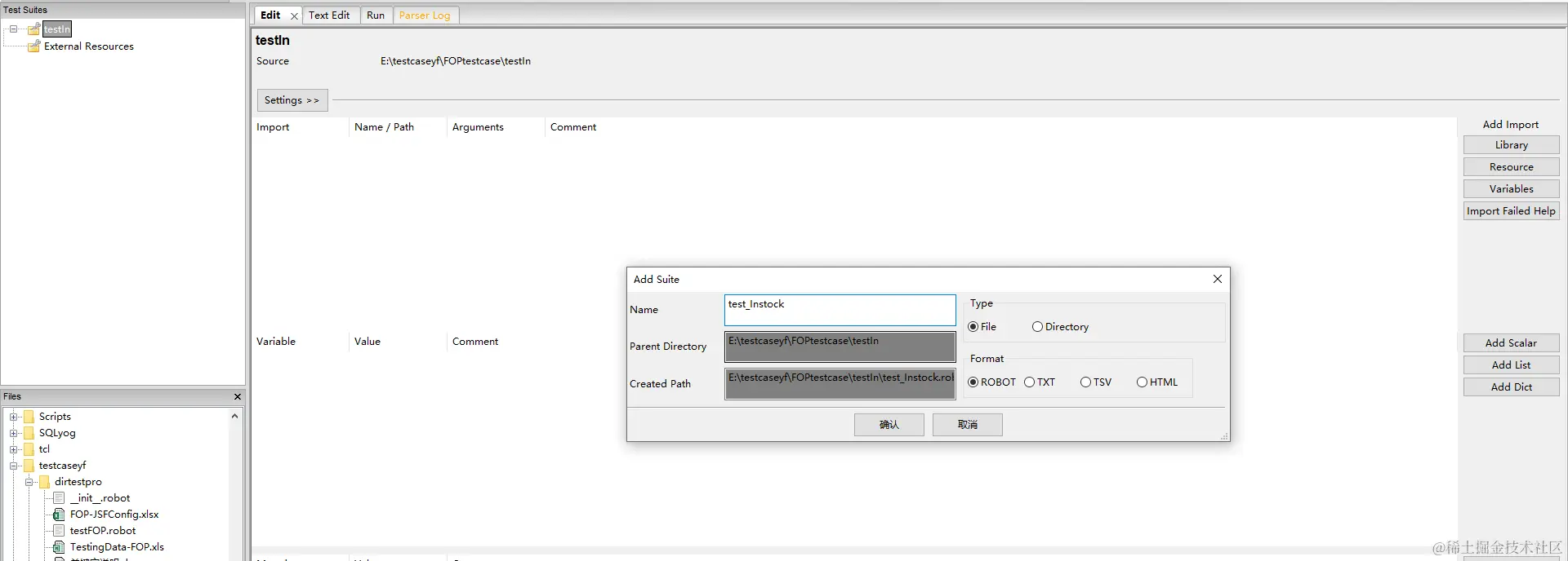 在Robot中我们首先需要创建一个testSuite,因为在Robot中case都是挂在Suite下的,在项目上右击—>New Suite,这里需要输入一个Suite的name,这里我们叫它“test_Instock”吧;