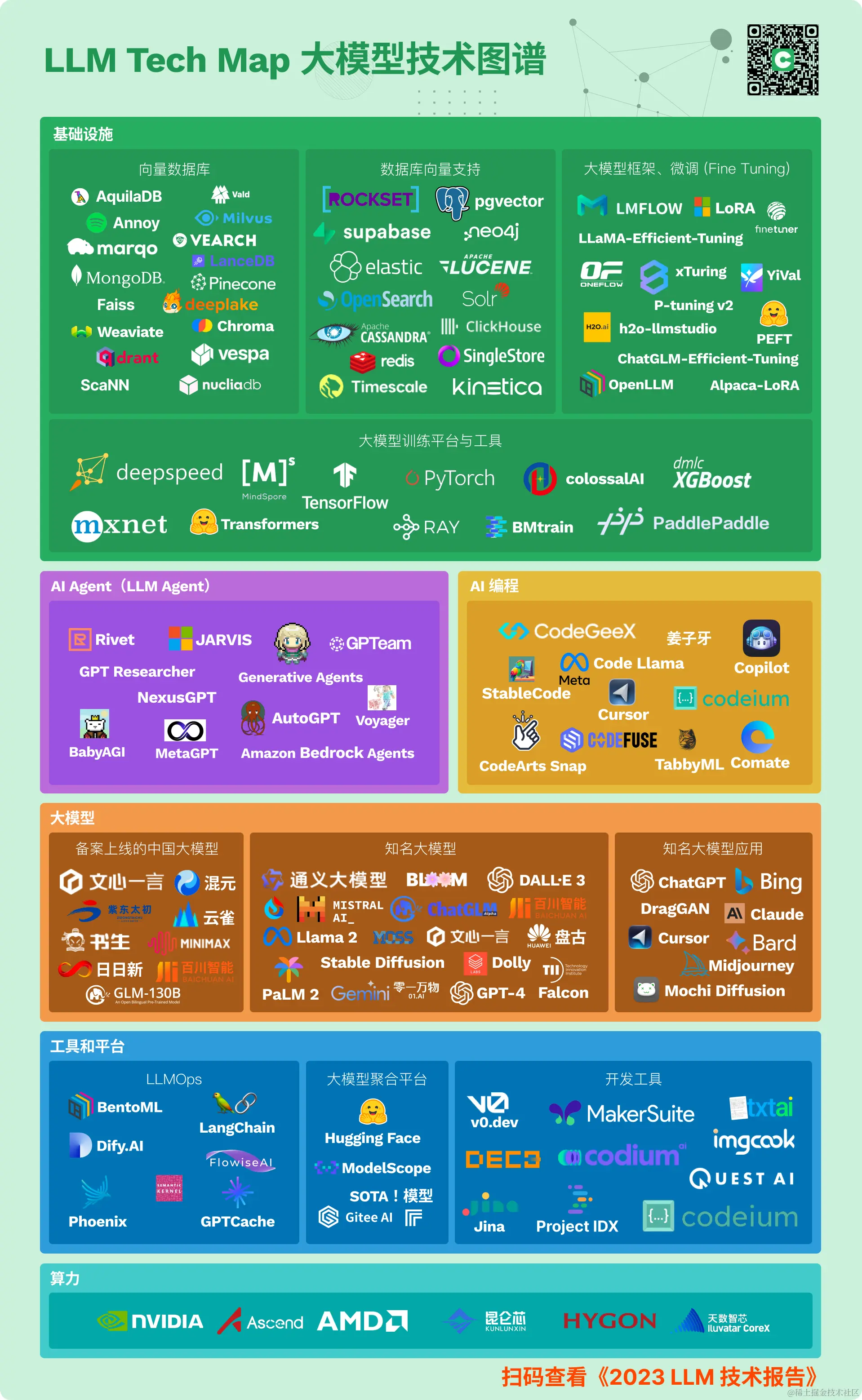 《2023 LLM 技术报告》现已与《2023 中国开源开发者报告》共同发布,此报告整体围绕 LLM Tech Map 梳理逻辑来展开。从基础设施、大模型、Agent、AI 编程、工具和平台,以及算力几个方面,为开发者整理了当前 LLM 中最为热门和硬核的技术领域以及相关的软件产品和开源项目。