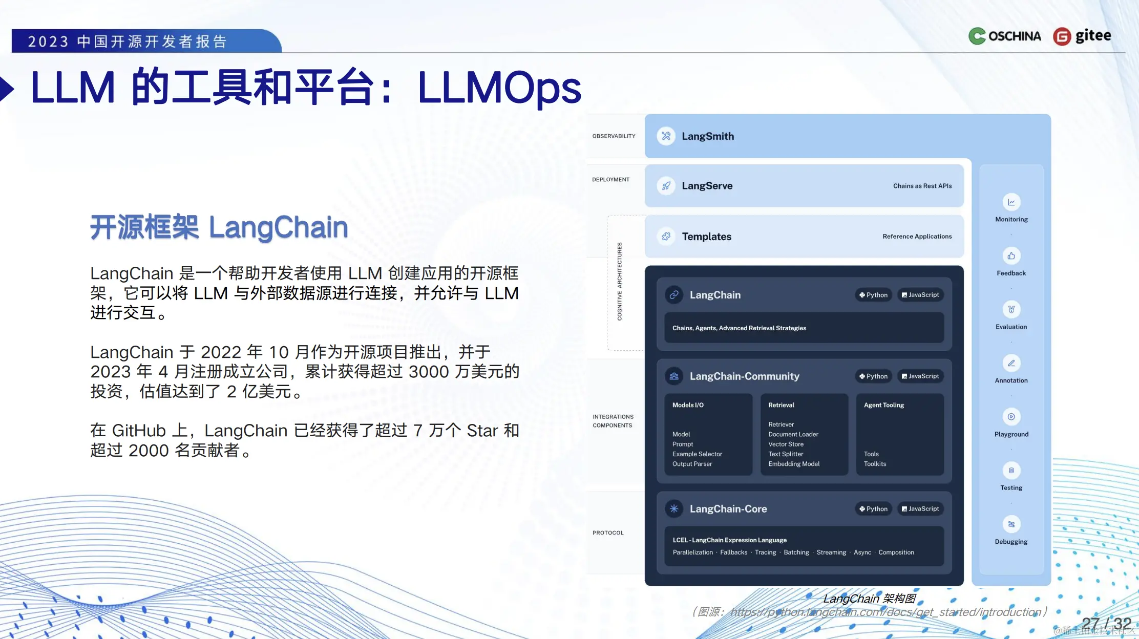 LangChain 的出现,实现了 LLM 之间的链式交互,使多个 LLM 模型串联工作,发挥各自的优势,并且可以将 LLM 模型与外部数据源进行连接,产生更强大的语言理解和生成效果。这开启了 LLM 集成应用的新方向,并诞生了一个新的细分领域**“LLMOps”**。