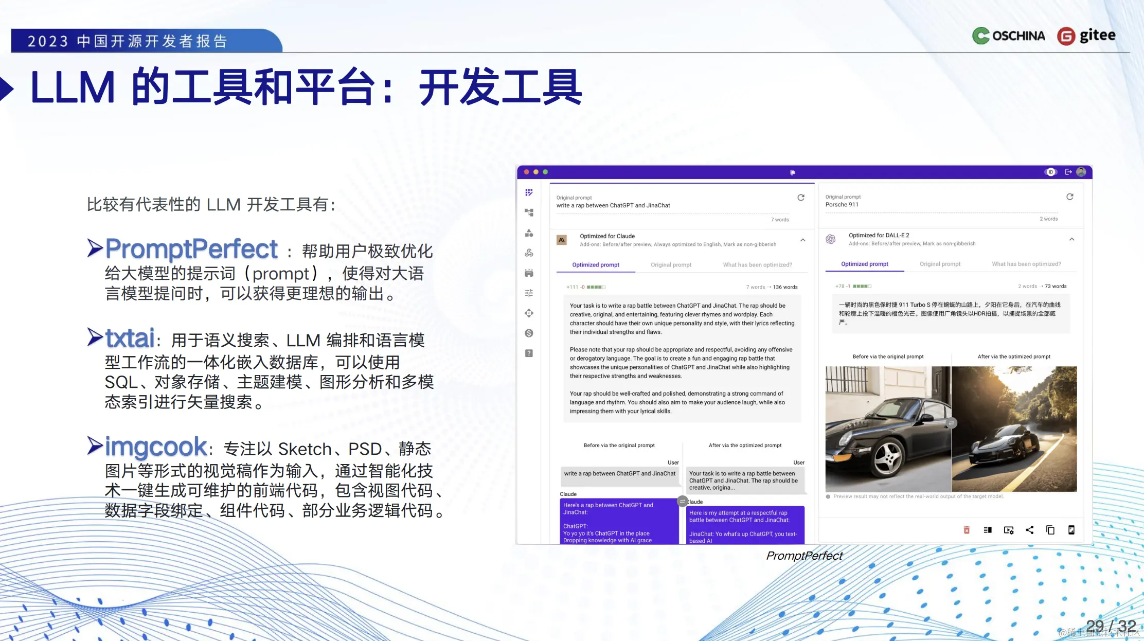 镜头给到国内。相比国际上当前逢 AI 必 GenAI,国内更多地还是在 LLM 这一层面,Robin Li 的“卷大模型没意义,卷应用机会更大”,其实很深刻地指出了内中区别。本报告以开发者视角为主,从 LLM 切入,但实际上或多或少与 GenAI 脱不开关系。