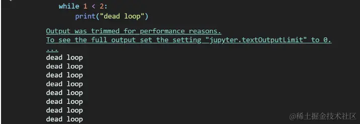 因为 1 永远小于 2,所以这段代码执行之后会无限输出 dead loop,在 Notebook 中执行如下所示,(注意左边的执行标志一直是 * 号,代表一直未执行完毕)。