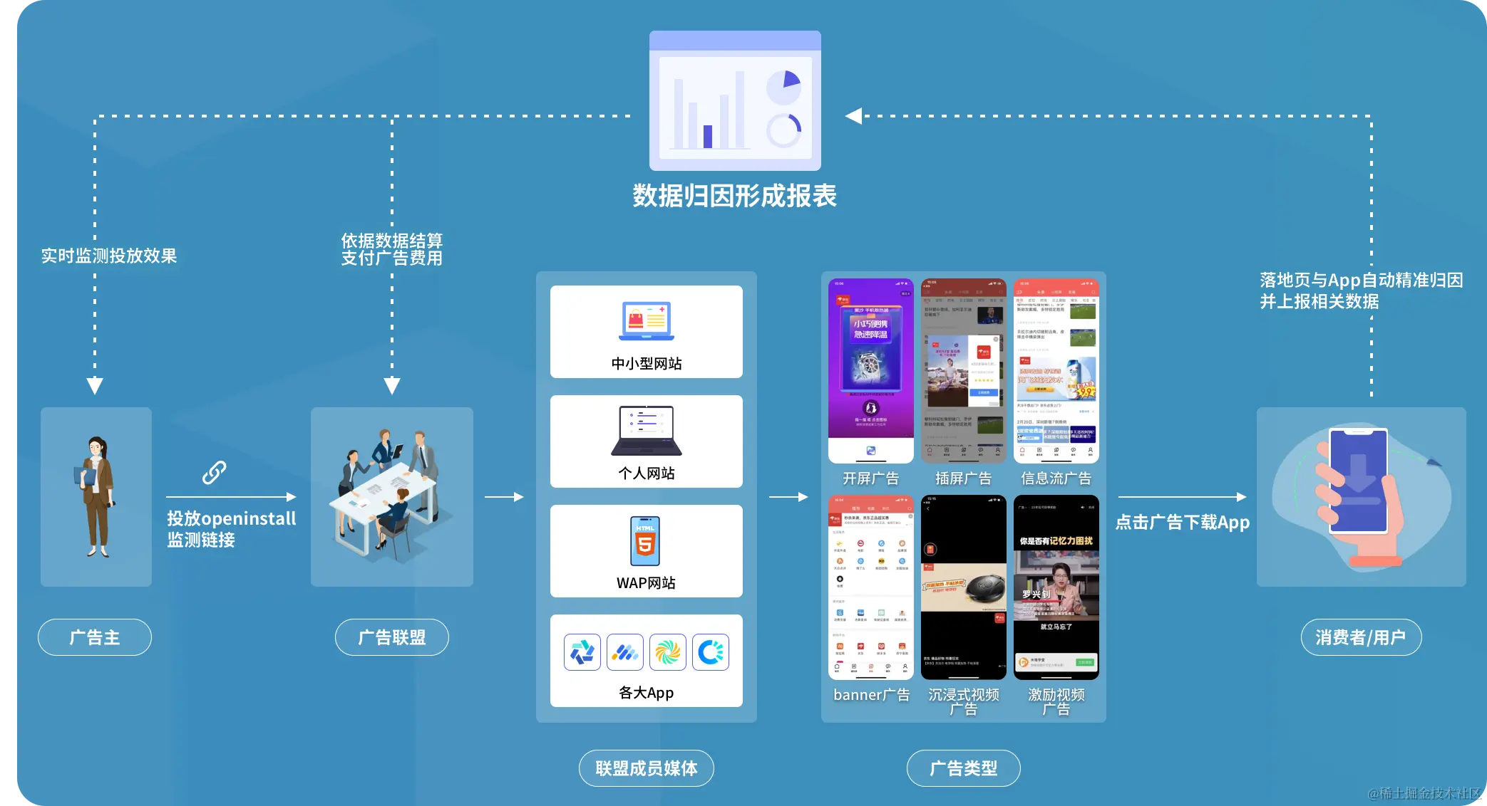 以广告联盟为例。有了这样的工具,广告主或广告联盟,只需要为多个渠道生成专属渠道参数的App下载链接,分发到各个联盟媒体以广告形式投放,用户访问落地页后下载App,相关数据就能被实时统计到报表中,广告主能够轻松分析各个联盟渠道不同广告位的投放效果数据,并依据数据给广告代理结算。
