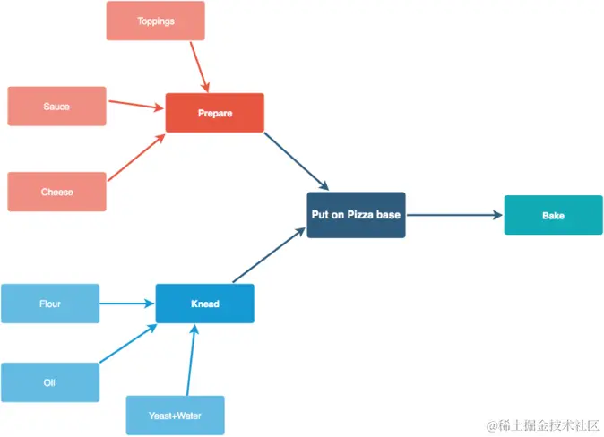 这里我们以“制作Pizza”的流程为例,简单的把操作拆分为4个阶段:准备食材Prepare(如鸡肉,起司,青椒等),揉面Knead(面粉,油,发酵),制作(组合准备的食材与披萨底座),最终烘焙完成。在整个流程中,前后阶段是隐含着依赖关系,并驱动每一个阶段继续执行下去。